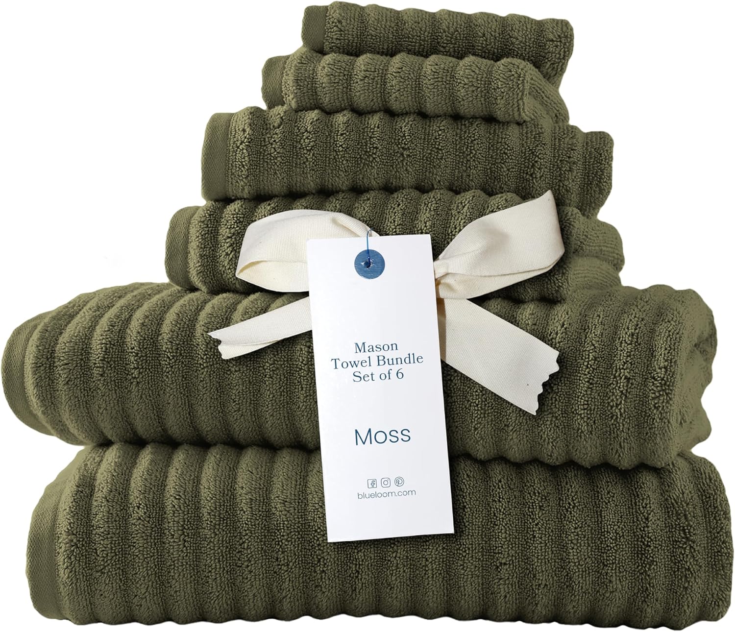 Blue Loom Ribbed Bath Towels Set, 100% Cotton 600GSM, Soft Absorbent Durable 2 Bath Towels, 2 Hand Towels, 2 Wash Cloths for Bathroom - Mason (58" x 30" inch Towels) (Moss, 6 Piece)