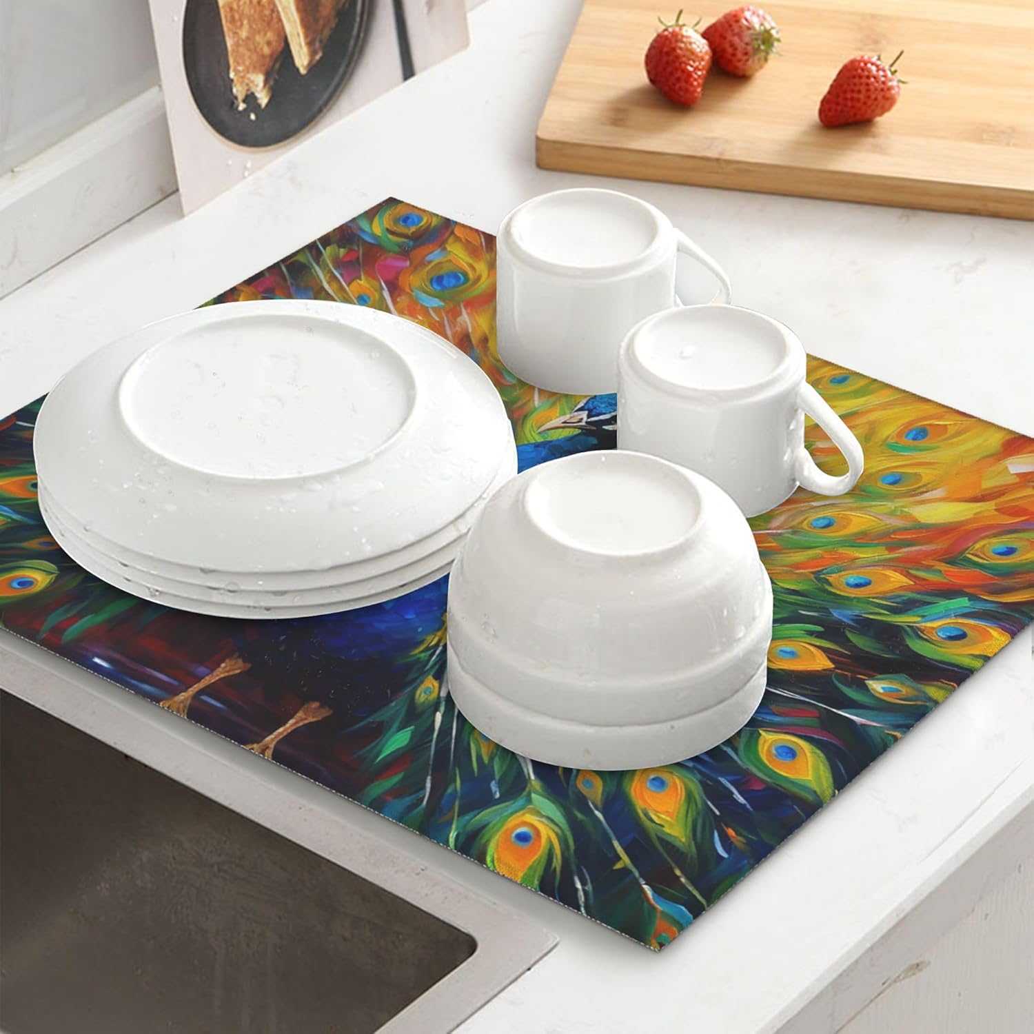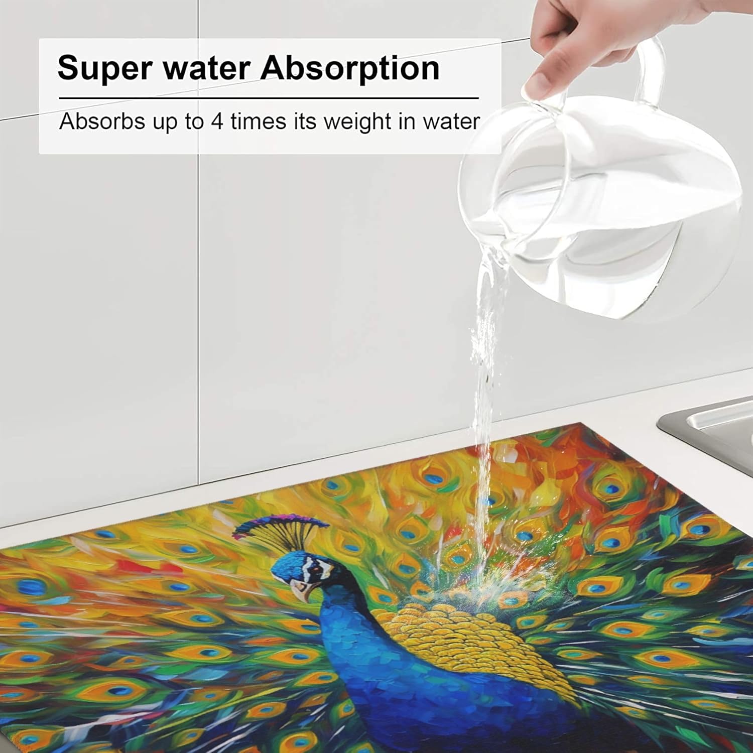 Beautiful Peacock Dish Drying Mat for Kitchen Counter Cute Dish Drainer Rack Mats 16"x18" Absorbent Reversible Drying Pad