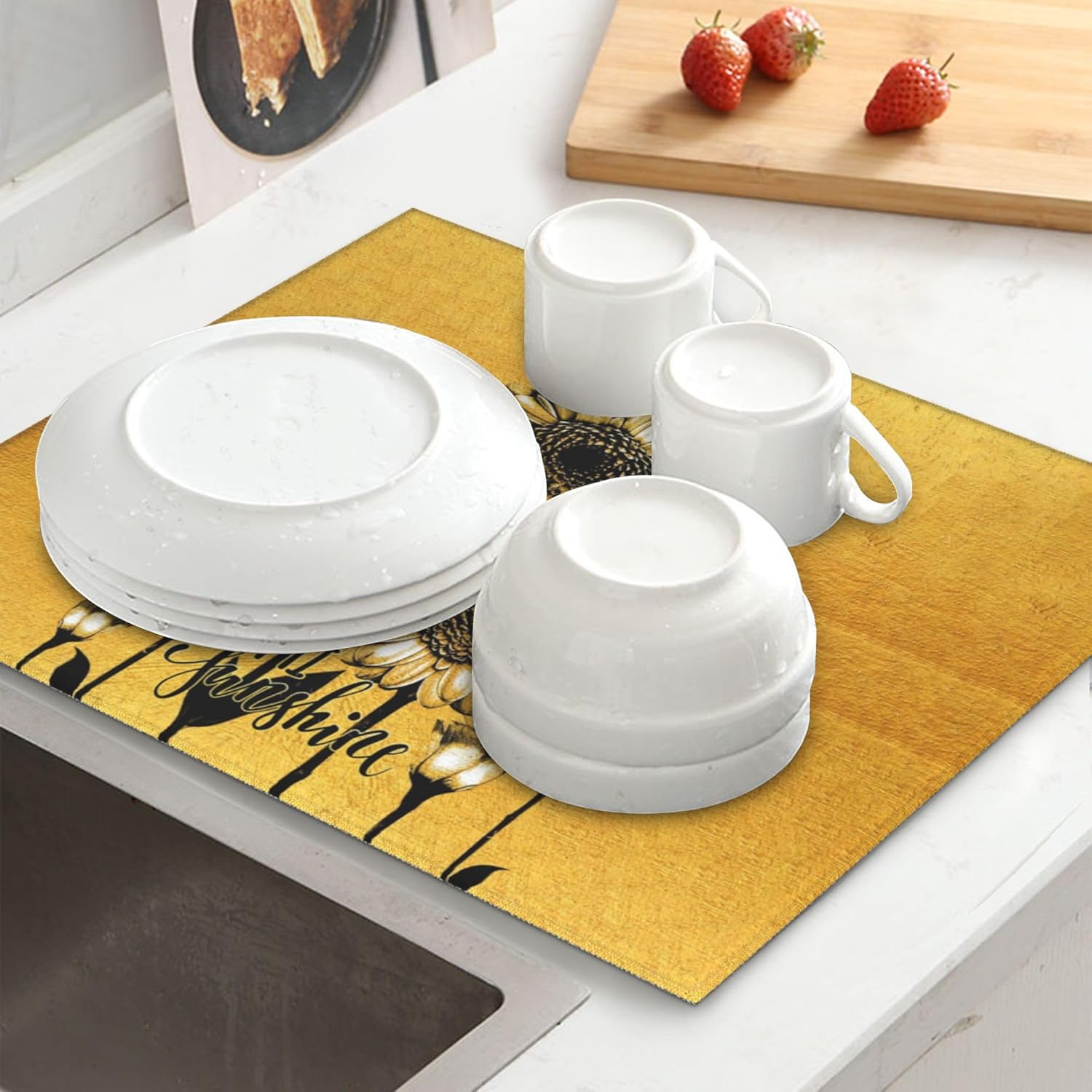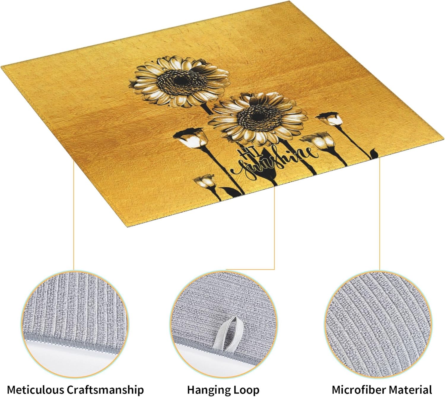 Sunflower Dish Drying Mat for Kitchen Counter Black Gold Washable Absorbent Reversible Microfiber Modern Drying Pad Kitchen Accessories 16x18 Inch