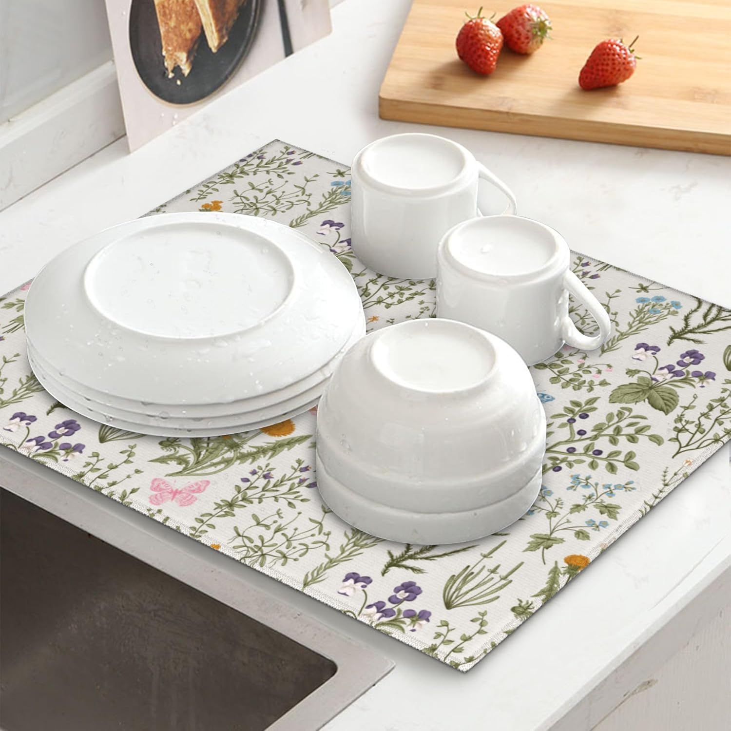 Vintage Floral Kitchen Drying Mat Herbs and Wild Flowers Microfiber Dish Drainer Mat for Kitchen Counter Cute Botanic Spring Summer Drying Pad Absorbent Reusable Washable 16x18 Inch