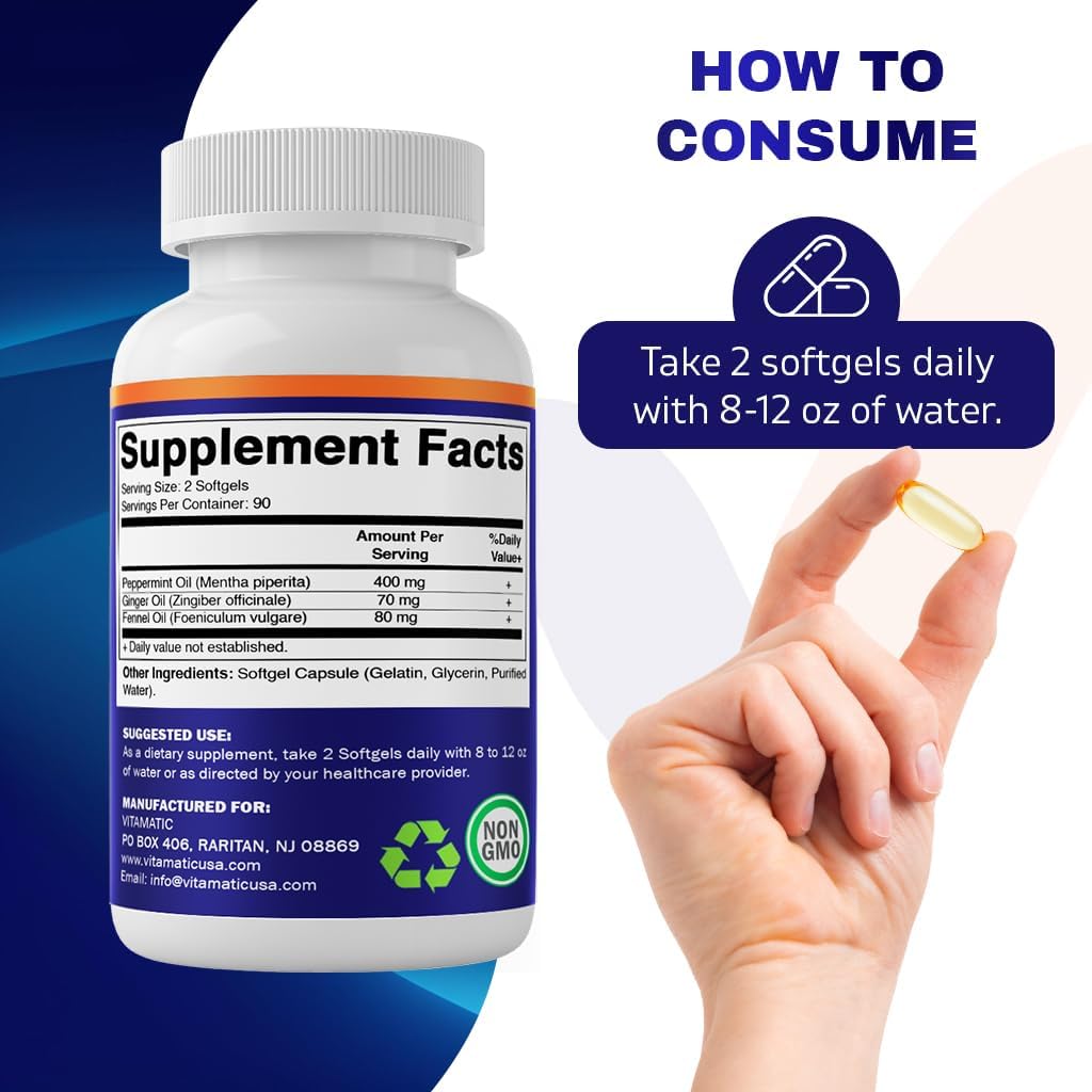 Vitamatic Peppermint Oil Gel with Ginger & Fennel Oils, 550mg per Serving, 180 Softgels