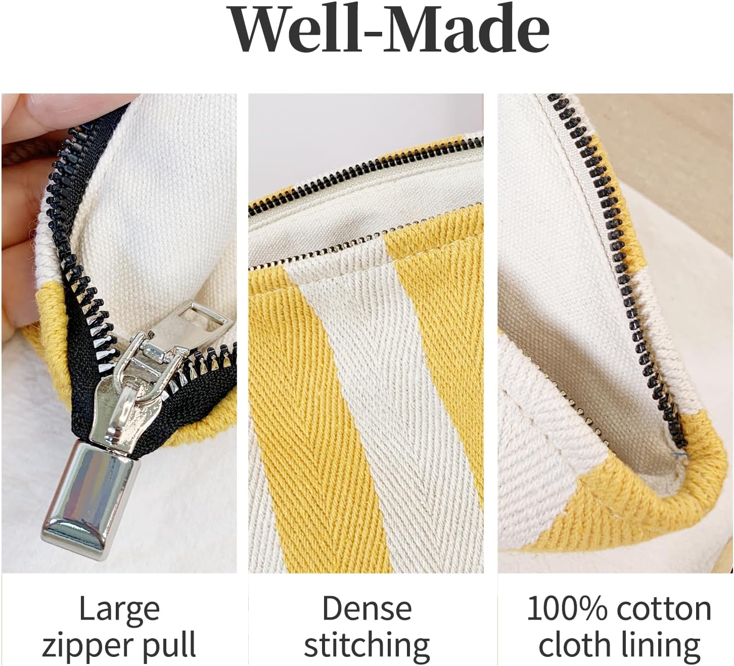 - STRIPED MAKEUP BAG: This cosmetic bag is made of canvas printed with yellow stripes so it is suitable for travel, vacations, business trips, gym, camping, and bathroom organization. not only is it a simple zipper bag, but it is also a functional makeup bag, a travel organizer bag for your cosmetic tools