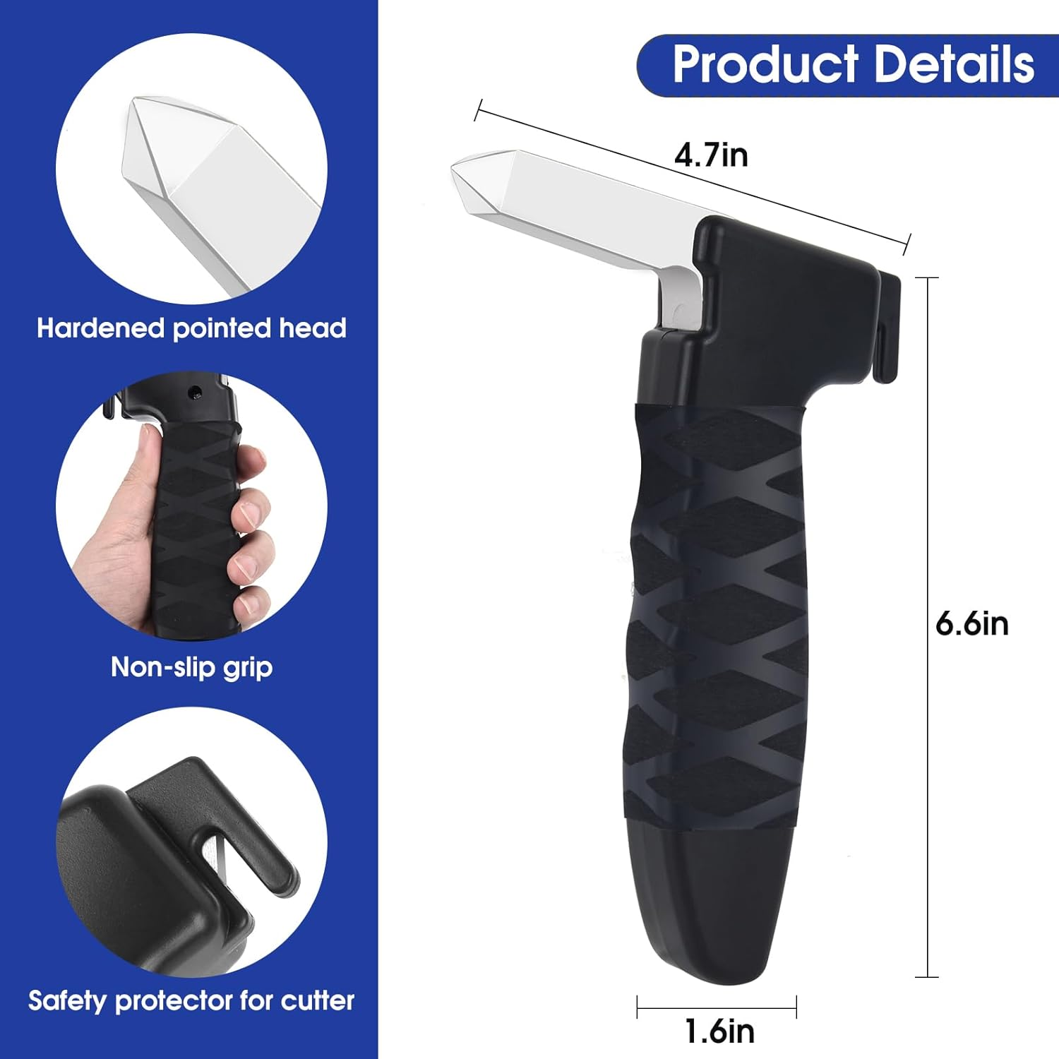 - ăMULTIFUNCTIONAL MATERIAL] The car door handle adopts a 3 in 1 design, the metal tip can be used to break the car window when in an eTHEmergency, meanwhile there is a small blade design in the upper groove of the handle,which can protect users from any harm during normal use and quickly cut the seat belt for escape when in emergency.