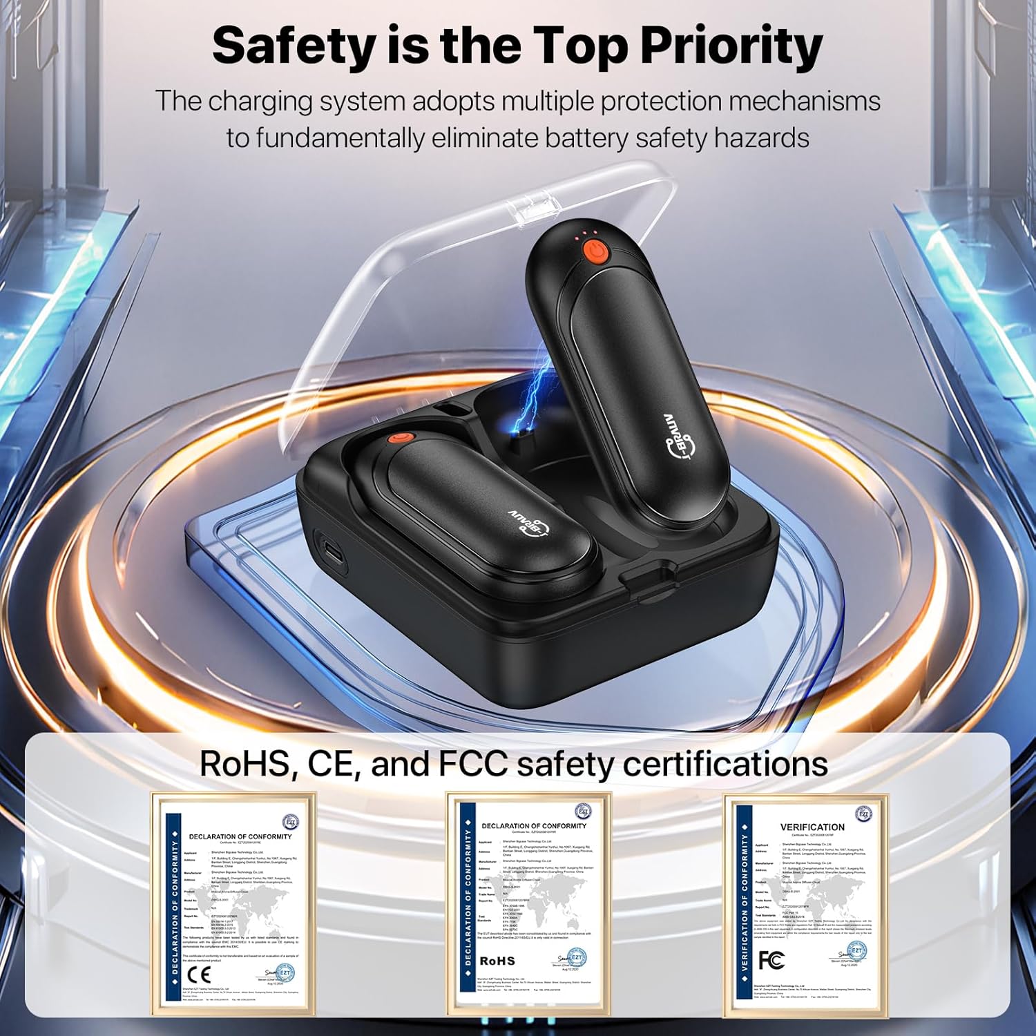 - Reusable & Rechargeable Hand Warmers: Each Rechargeable hand warmer features a powerful 2000mAh battery that ensures long-lasting heat. Comes with a 10000mAh fast charging case, allowing you to recharge on-the-go. The charging case also has its own built-in LED indicator to show the remaining power level