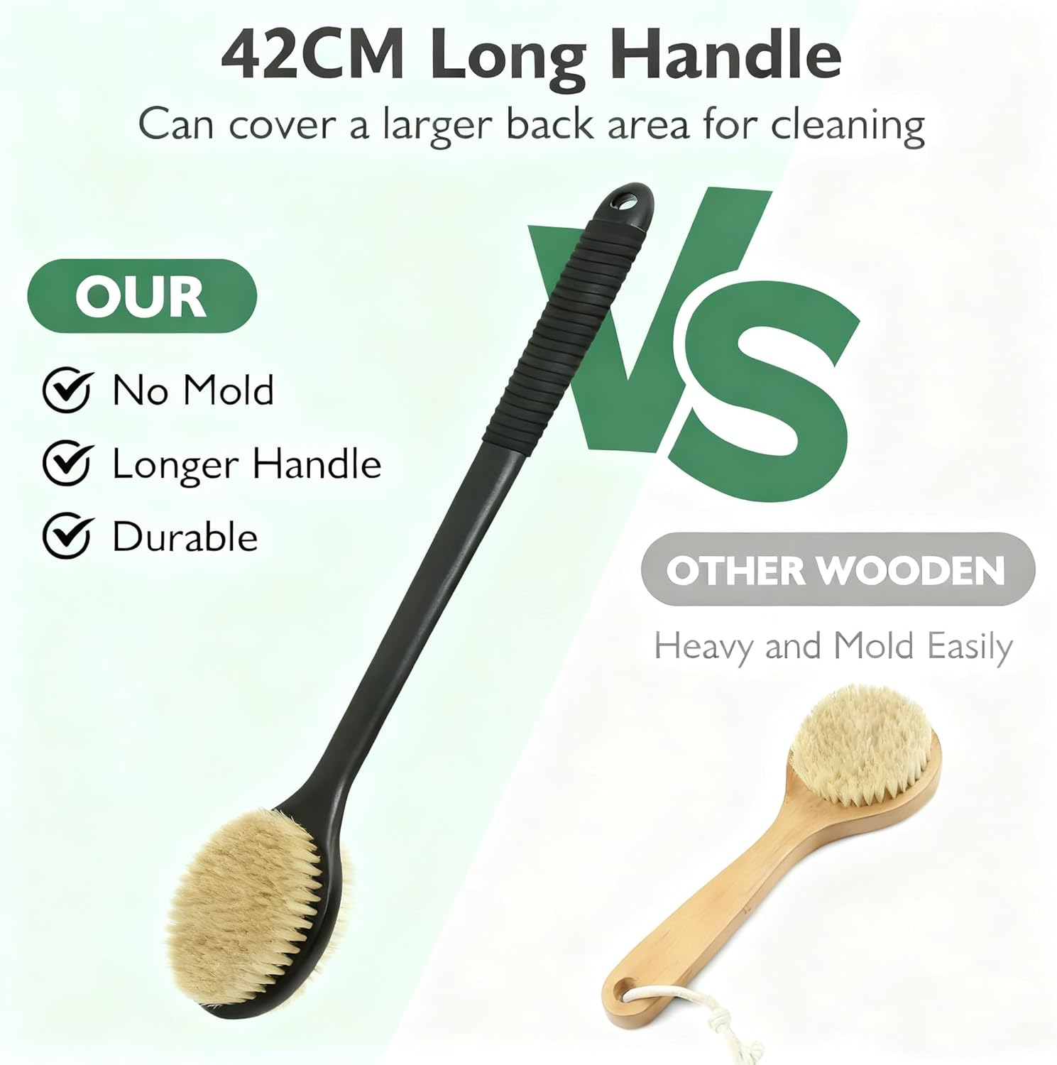 - 17-INCH LONG HANDLE, COVERS MORE: To enhance its functionality as a back brush for the shower, we upgraded the handle to 17 inches, allowing you to reach hard-to-access areas such as your back, lower legs, and feet—no need to bend over anymore. It is especially helpful for those who have difficulty lifting their shoulders or bending at the waist