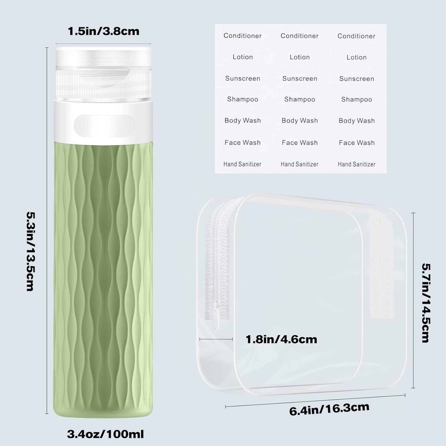 - TSA approval: 4 pack 3.4 oz travel bottles for toiletries are TSA approved that allows for unobstructed boarding. The tsa approved travel bottles are great for shampoo, conditioner, shower gel, lotion, hand sanitizer and ect. Additionally, the travel kit comes with a zippered clear transparent toiletry bag, which saves space, easy storage, and transportation. The travel size bottles are must have traveling accessories