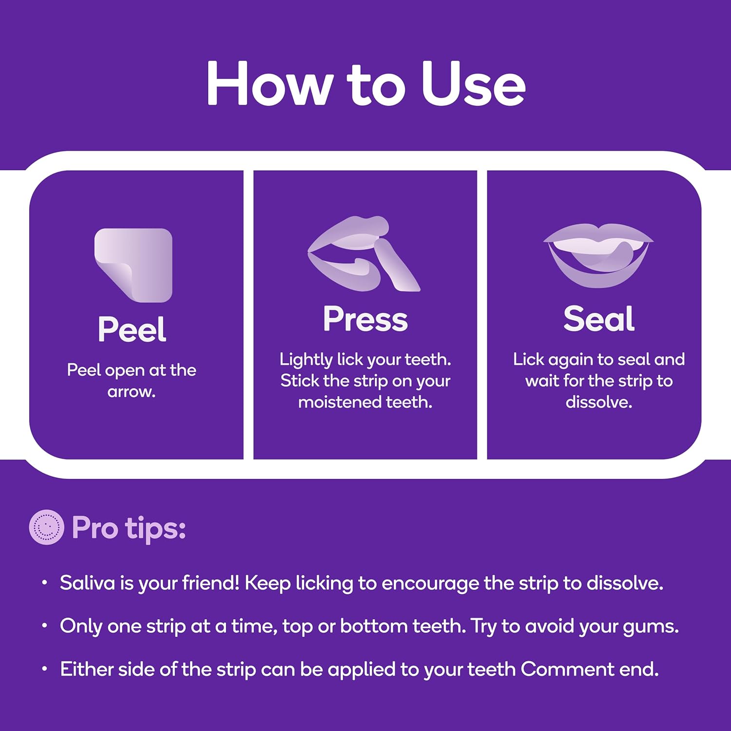 - π ππ¦π¦-ππ₯ππ / π€π¨πππ & πππ¦π¬ π§π’ π¨π¦π: Simply apply a strip to your teeth (top or bottom), and let it dissolve to reveal a brighter, more confident smile.