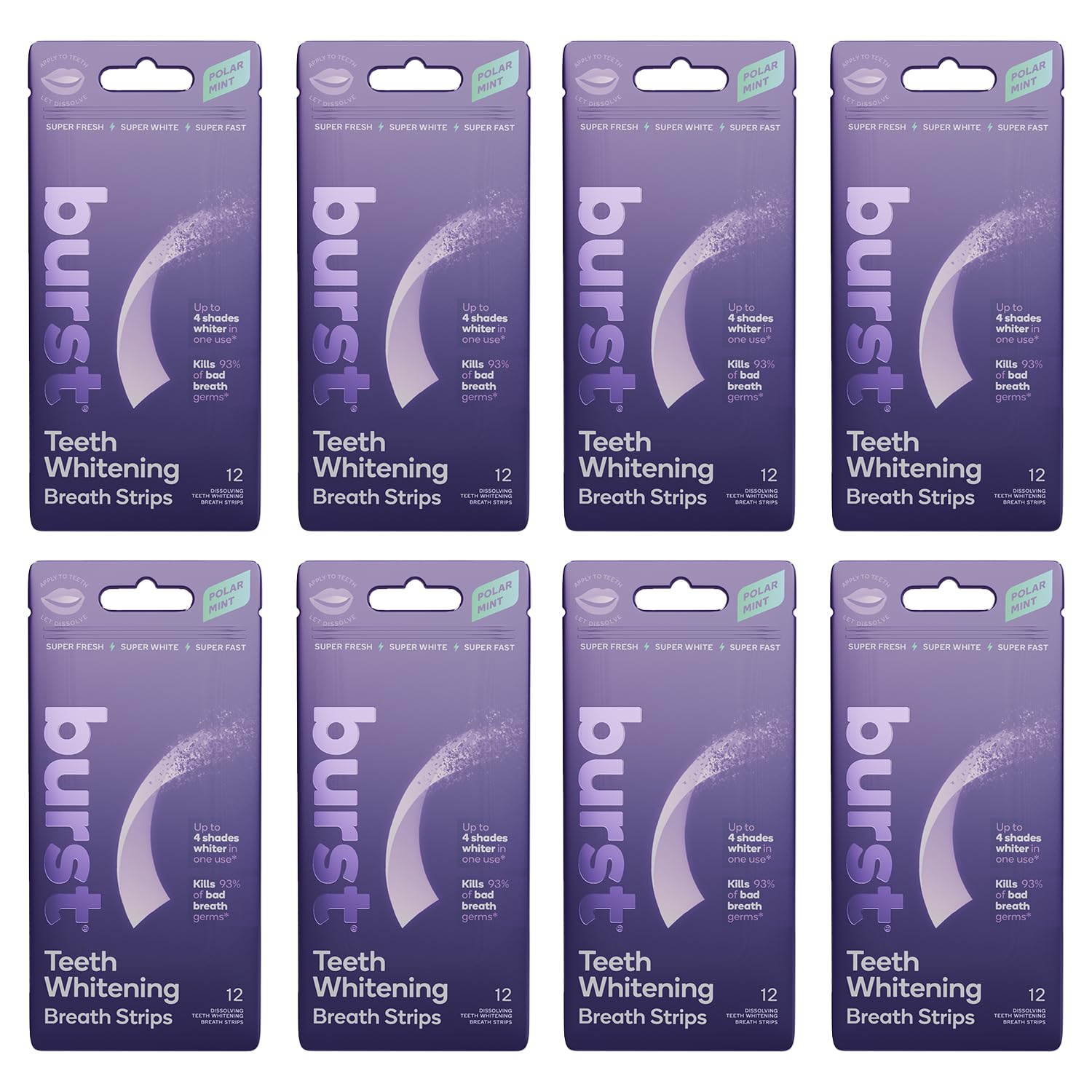 Burst Teeth Whitening Breath Strips (Polar Mint/8 Pack) | Kills 93% of Bad Mouth Germs | Up to 4 Shades Whiter in One Use | Easy to Apply/Quick Dissolving