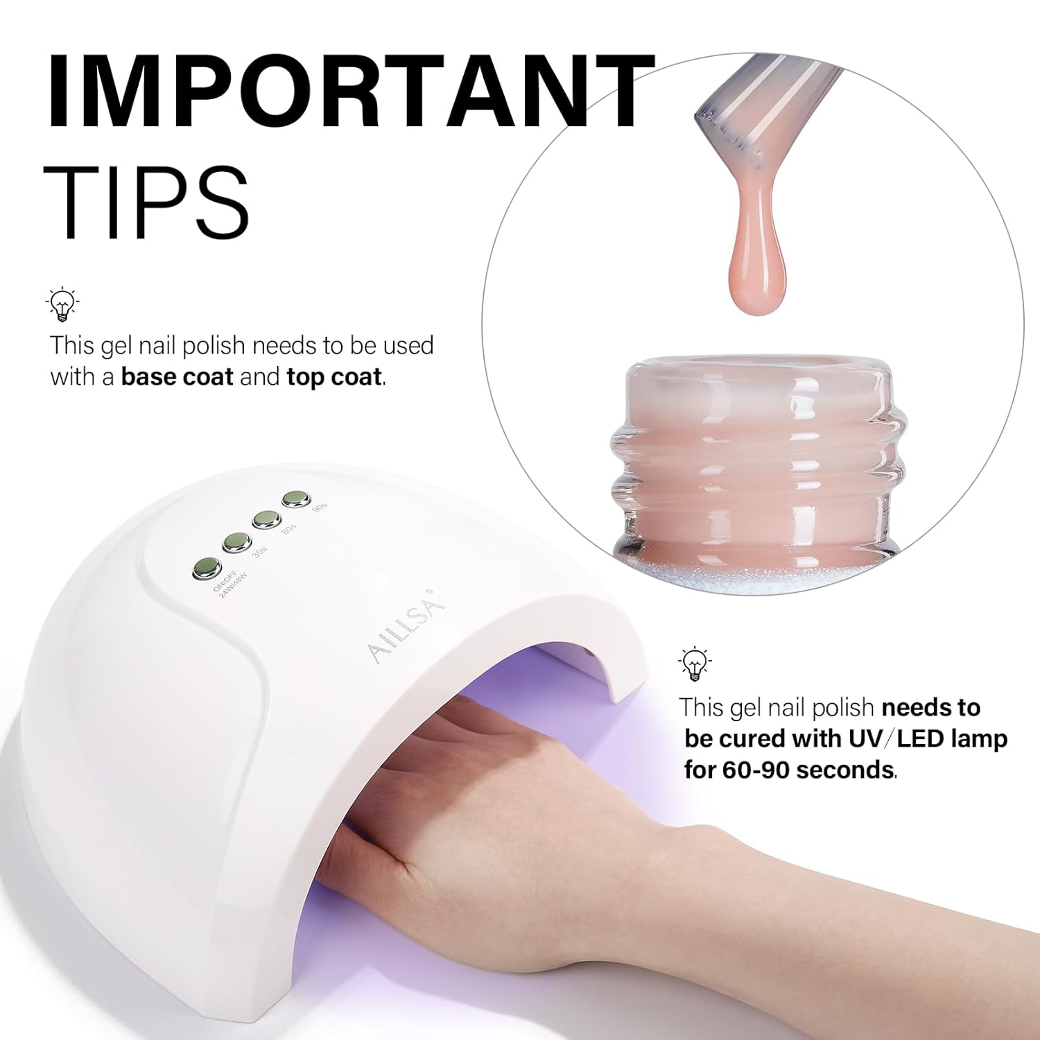 - Long Lasting 21+ Days: AILLSA translucent gel polish needs to be used with base coat and top coat, and depending the type of top coat, you can get a glossy or matte nails. With the correct application process, the gel nail polish will last over 21+ days. *Using a high quality base coat will make this manicure last longer.