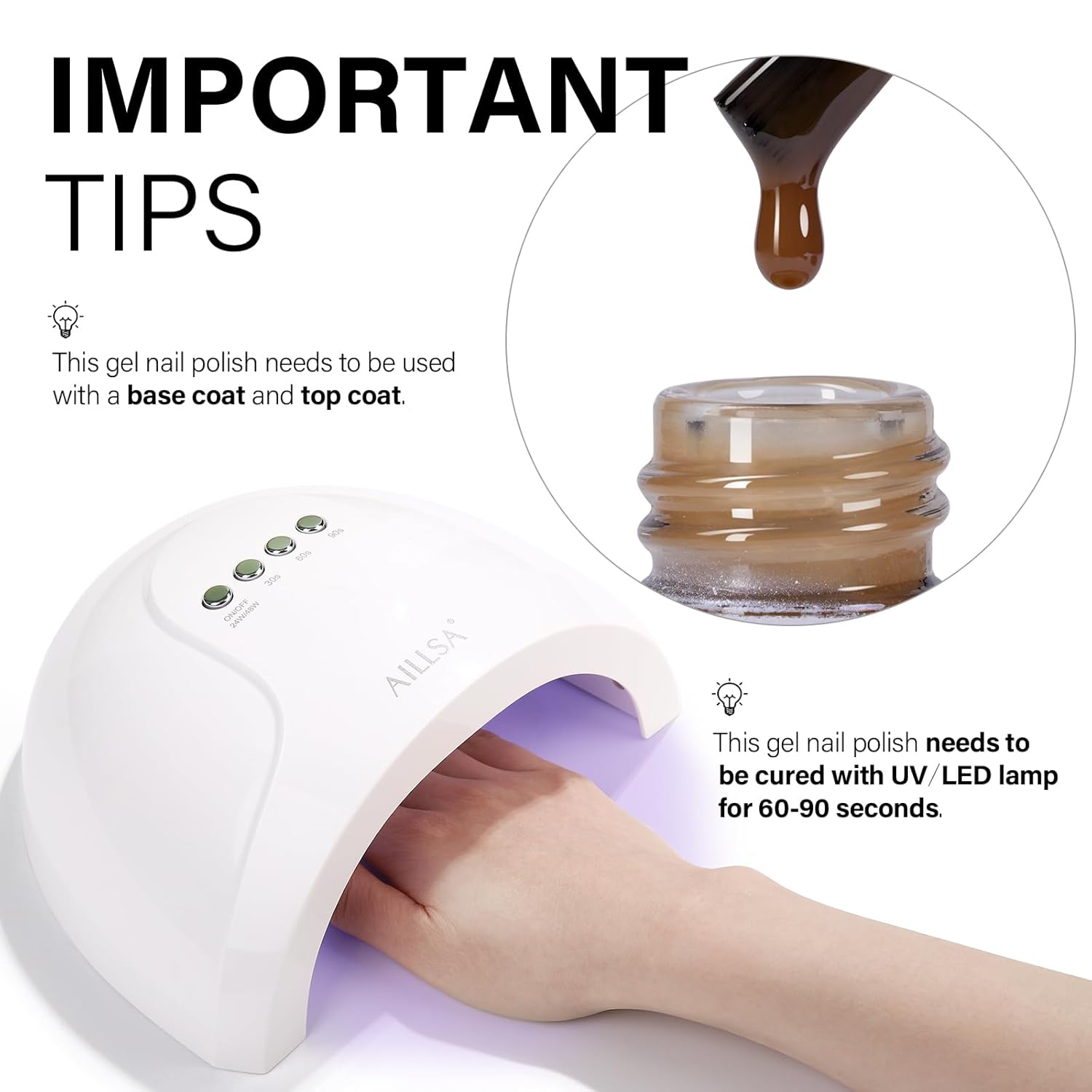 - Long Lasting 21+ Days: AILLSA translucent gel polish needs to be used with base coat and top coat, and depending the type of top coat, you can get a glossy or matte nails. With the correct application process, the gel nail polish will last over 21+ days. *Using a high quality base coat will make this manicure last longer.