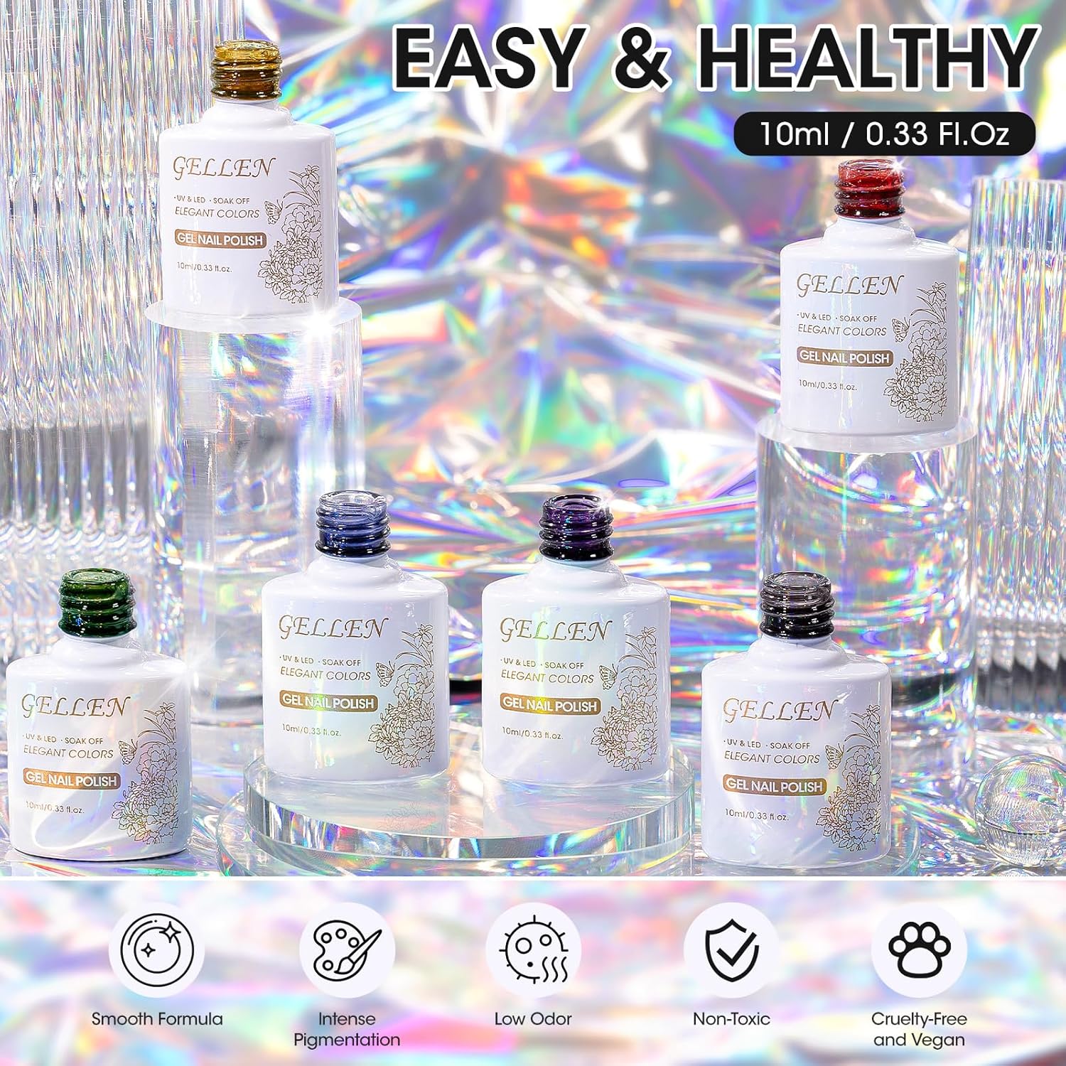- Ideal Gift for Her: GELLEN gel polish appropriate for any holiday or special event, such as a birthday, holiday, anniversary, spring outing gift, Valentine's Day, Christmas, Mother's Day and so on. No more struggling to decide which colors to select. This item is UV gel. It remains sticky after curing and must be used with a base coat and top coat. This item does not include base & top coat, which needs to be purchased separately