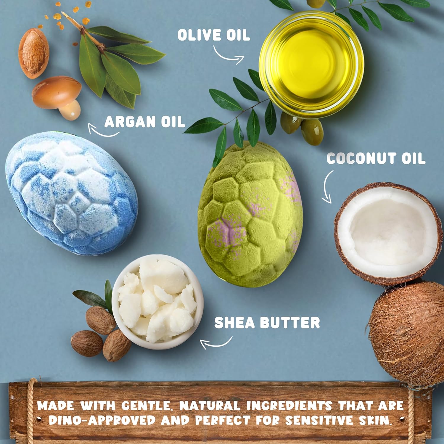 - All Natural Dino Delight- Experience the all natural bliss of our Dinosaur Eggs Bath Bombs! Crafted with natural ingredients, these fizzing wonders not only unleash playful dinos but also soften your child's skin. Dive into a bath filled with moisturizing and irresistibly soft joy, elevating bathtime with every dinosaur bath bomb.