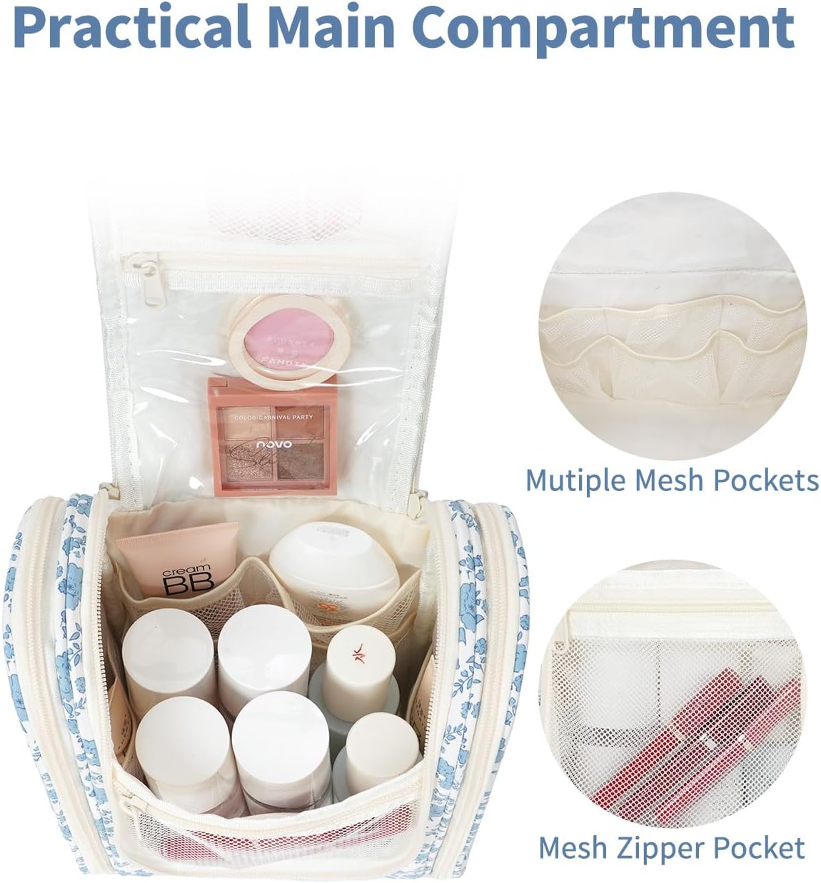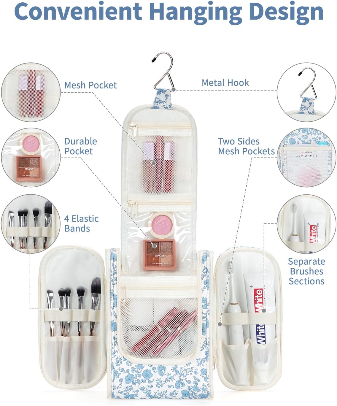Narwey Hanging Toiletry Bag Women Travel Makeup Bag Organizer Toiletries Bag for Travel Size Essentials Accessories Cosmetics (Medium,Little Blue Flower)