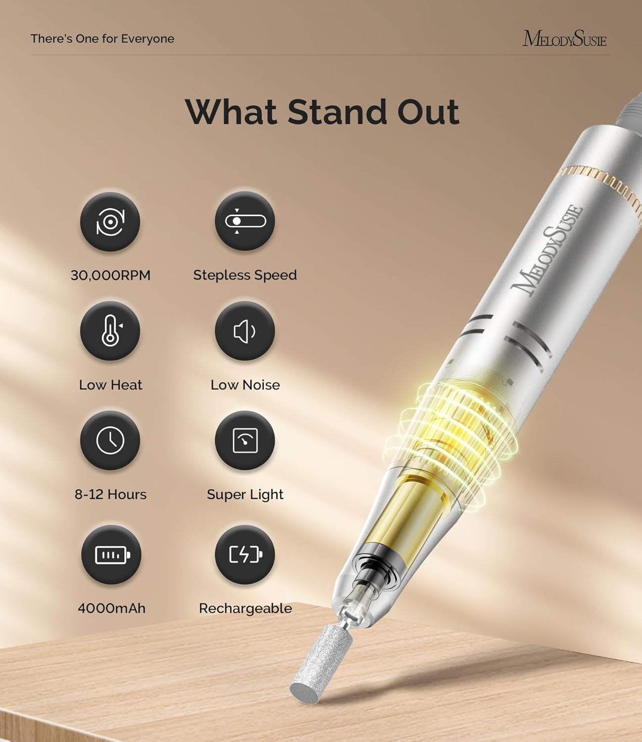 MelodySusie Portable Nail Drill 30000 RPM,Professional Rechargeable Electric Nail File,SC320F Cordless Nail E File for Acrylic Nails Gel Polishing Removing,Efile Nail Kit for Manicure Salon Home,Pink