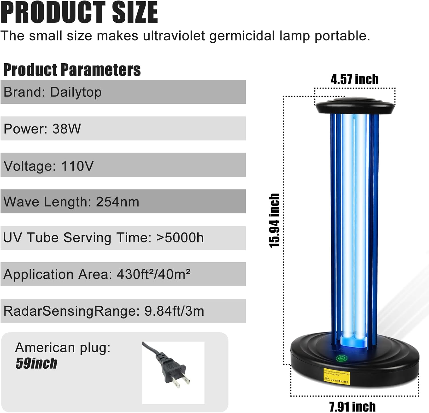 - ATTENTION -After the UV light is turned on, it will emit a 30-second beep to warn you to leave the room. Please do not approach the UV light when it is working, please leave the room. Protective eyewear only protects for 5 seconds, please do not look directly at the UV lamp for a long time.After the UV lamp is finished working, please ventilate the room for 30 to 60 minutes before entering the room.