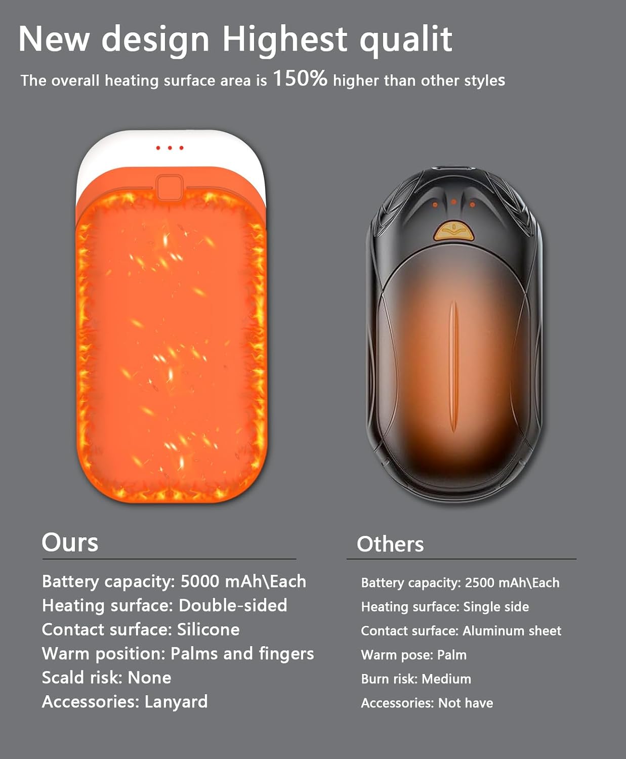 - 【Double-side heating】:Double-sided heating aluminum sheet combined with heat-conducting silicone achieves 360 ° heating surface, minimum 104 ℉ - maximum 131 ℉. Warm your entire palm and fingers, 5000mAh X 2 Packs keep you warm for up to 7-20 hours in cold winter