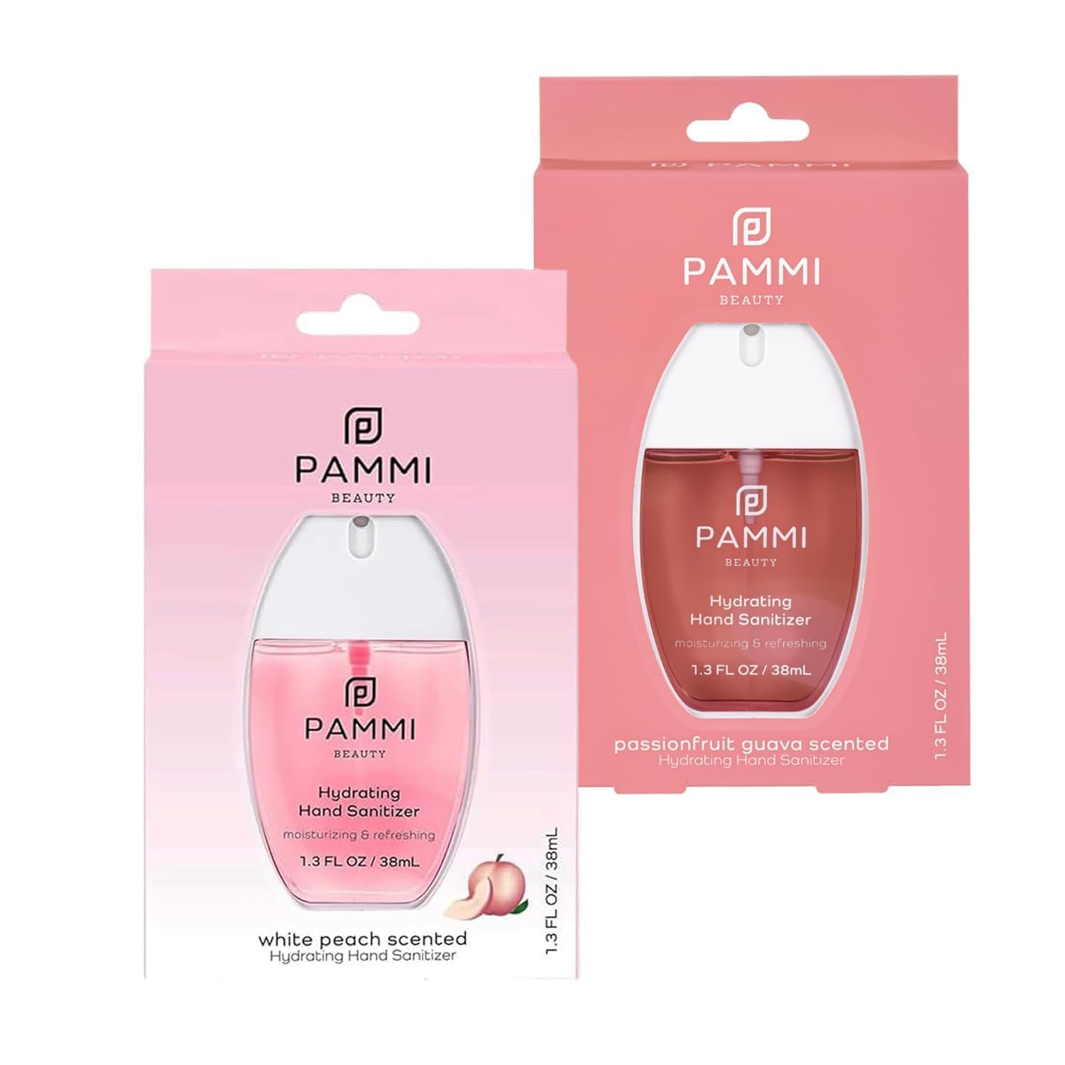 PAMMI Power Mist Hydrating Hand Sanitizer Spray, Portable Travel Size Pocket Hand Sanitizer, Scented Handsanitizer Mini Spray For Car - 600 Sprays (2 Packs (Guava, Peach))