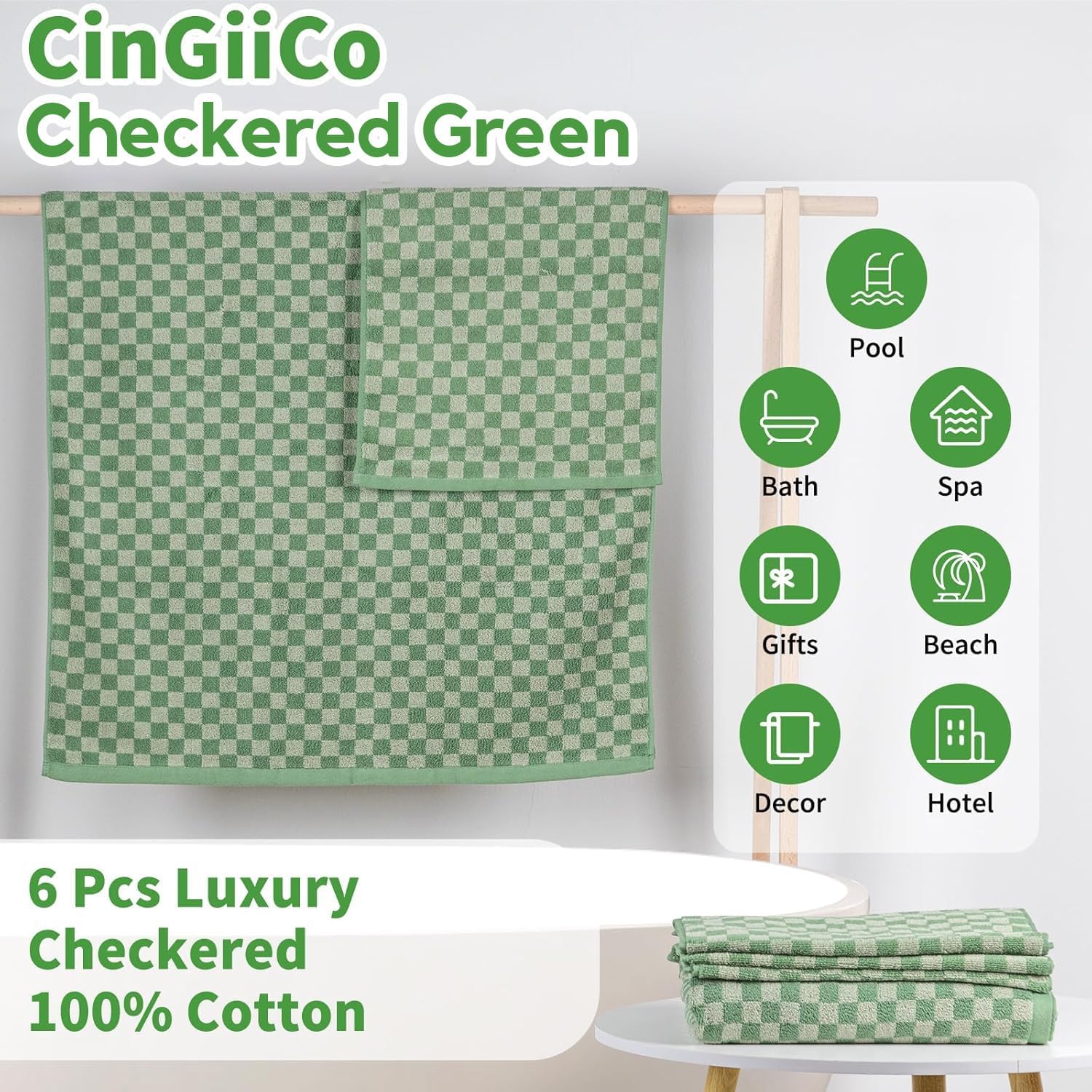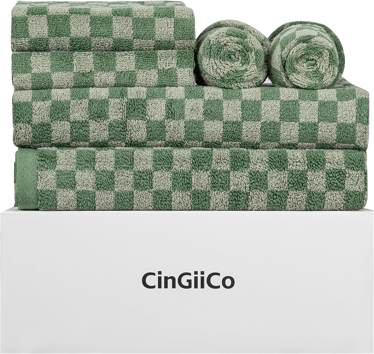 - CinGiiCo Bath Towel Set Includes: Checkered Cotton Bath Towels Large * 2 (55.12"*27.56"), Hand towels * 4 (29.52"*13.77"), Dark Green. Family sharing fun set for life's needs. Soft & Absorbent & Quick-dry