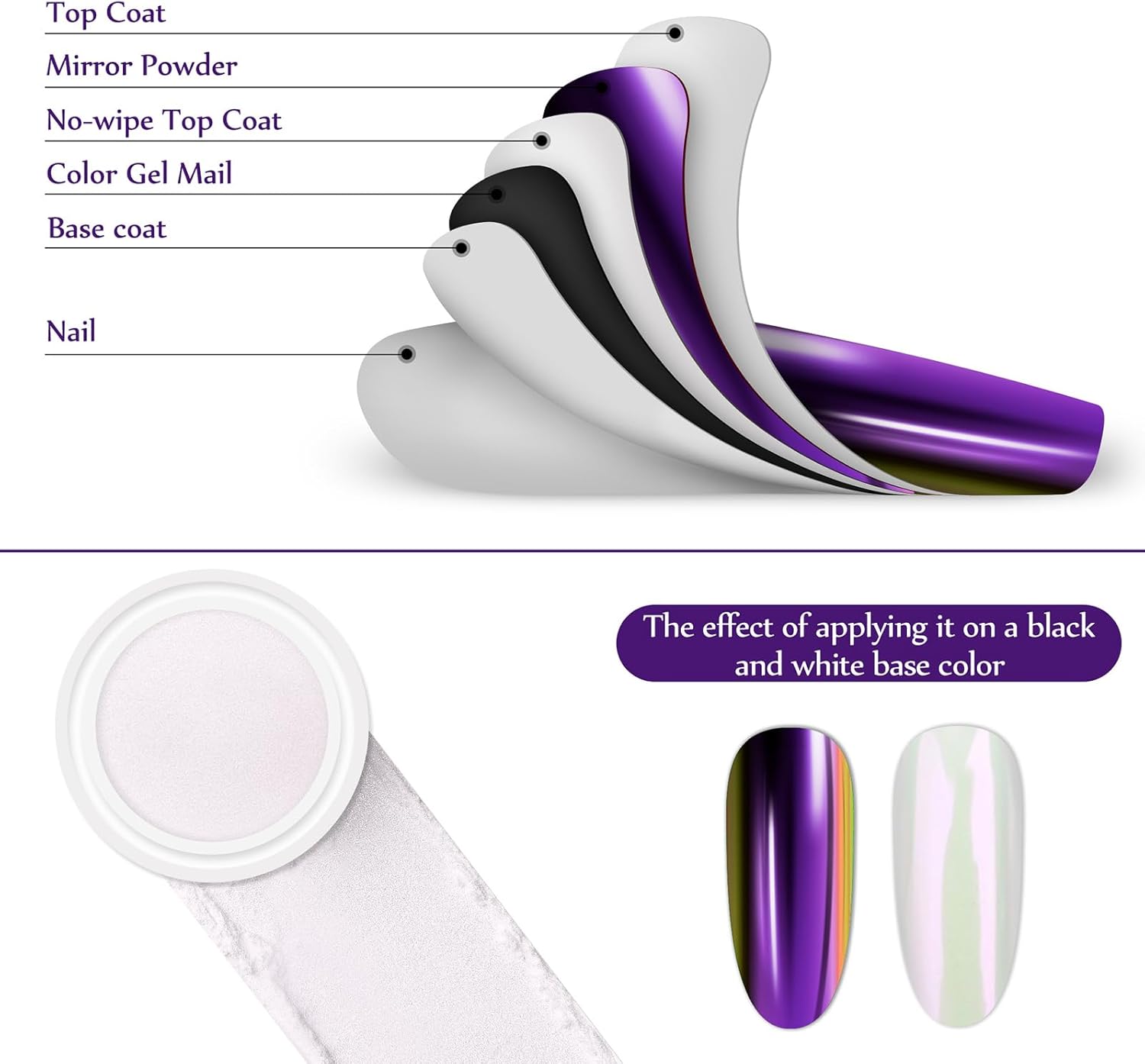 - 【The Scope Of Application】:All chrome powders should only be applied to glossy No wipe top coat to embellish Nail-Polishes color. Otherwise it is unusable, it can't be applied directly to the nail, and it can't be applied directly to the skin. Artdone chrome powder can be applied on UV gel nails, acrylic nails or false nail tips. You can use them very easily