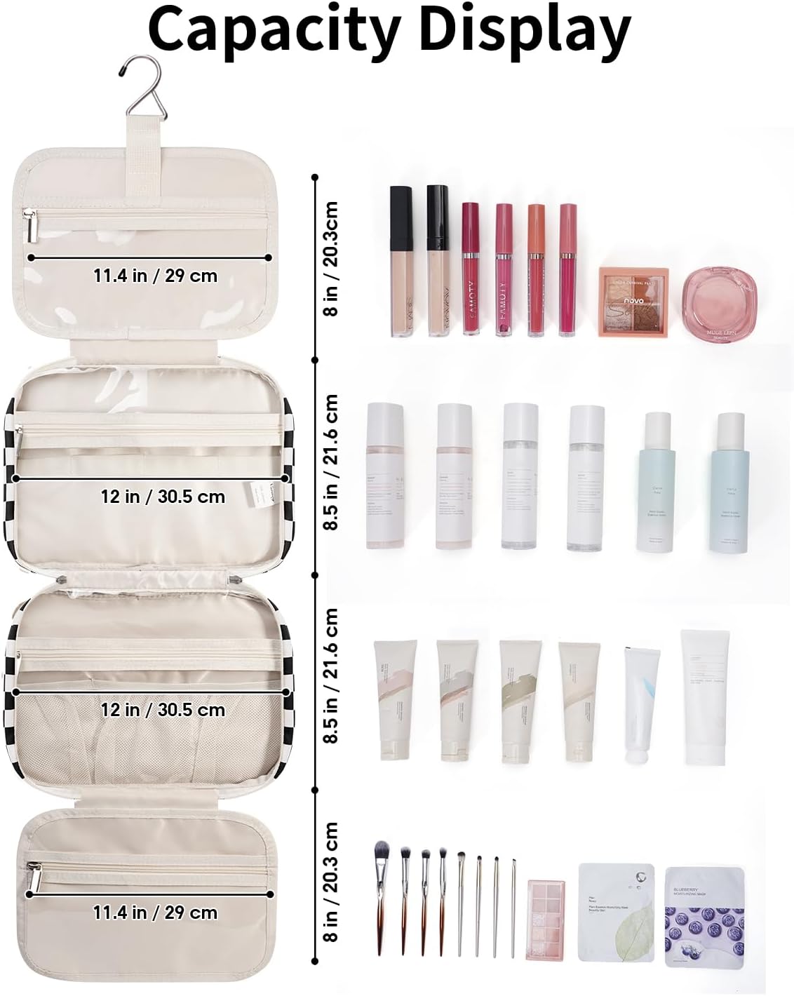 - LARGE VERSION - Fold size 12"x9"x5.5”/30.5x22x13 cm. We launch larger version to meet large-capacity, which you may choose large or medium size based on your needs. It could easily fit full-size travel essentials like shampoo & conditioner, lotion, face wash, toothpaste, toothbrushes, hair brush and daily makeups