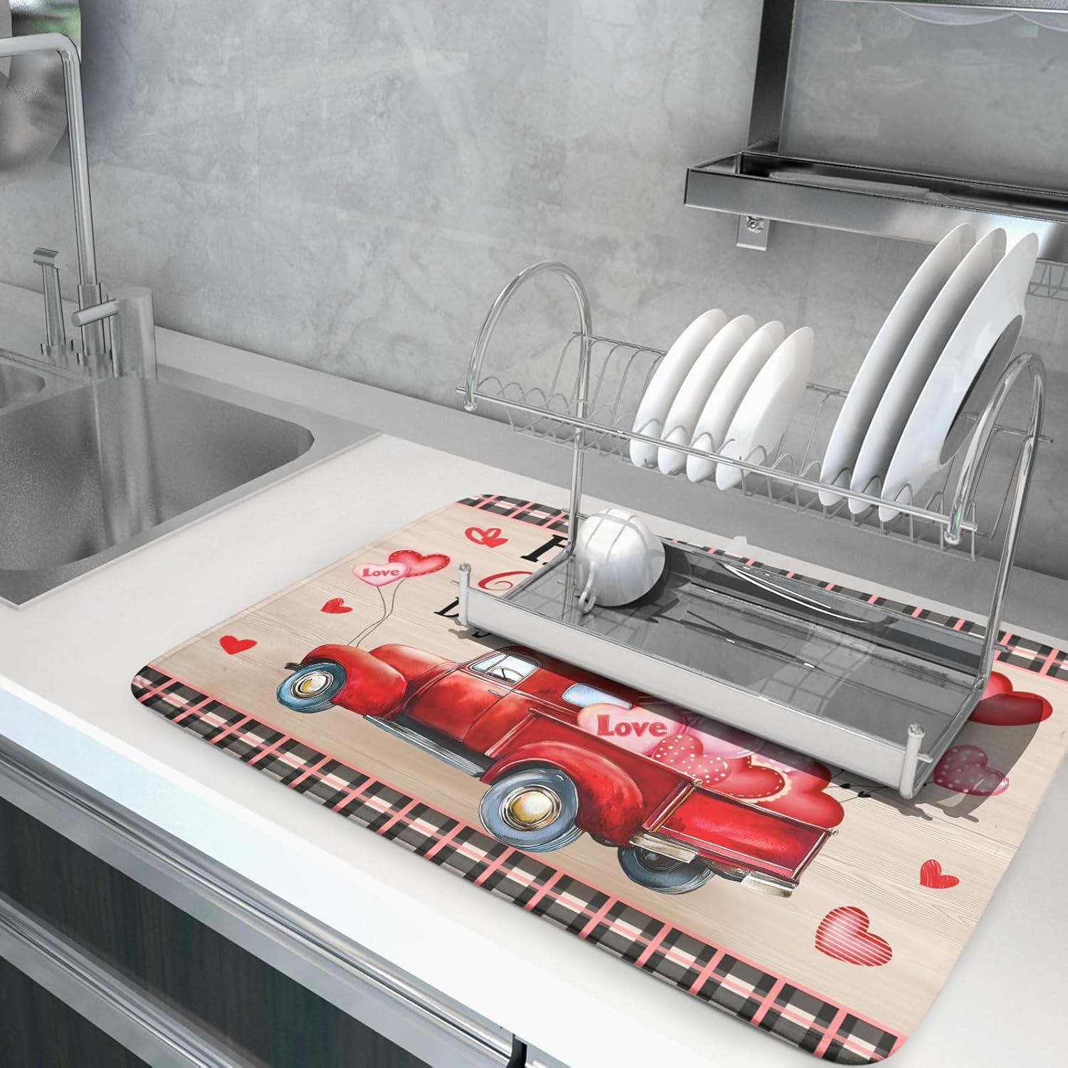 Valentine's Day Truck Dish Drying Mat 18x24 inch Love Heart Washable Absorbent Dishes Pad Dish Drainer Mat for Kitchen Counter Sink Coffee