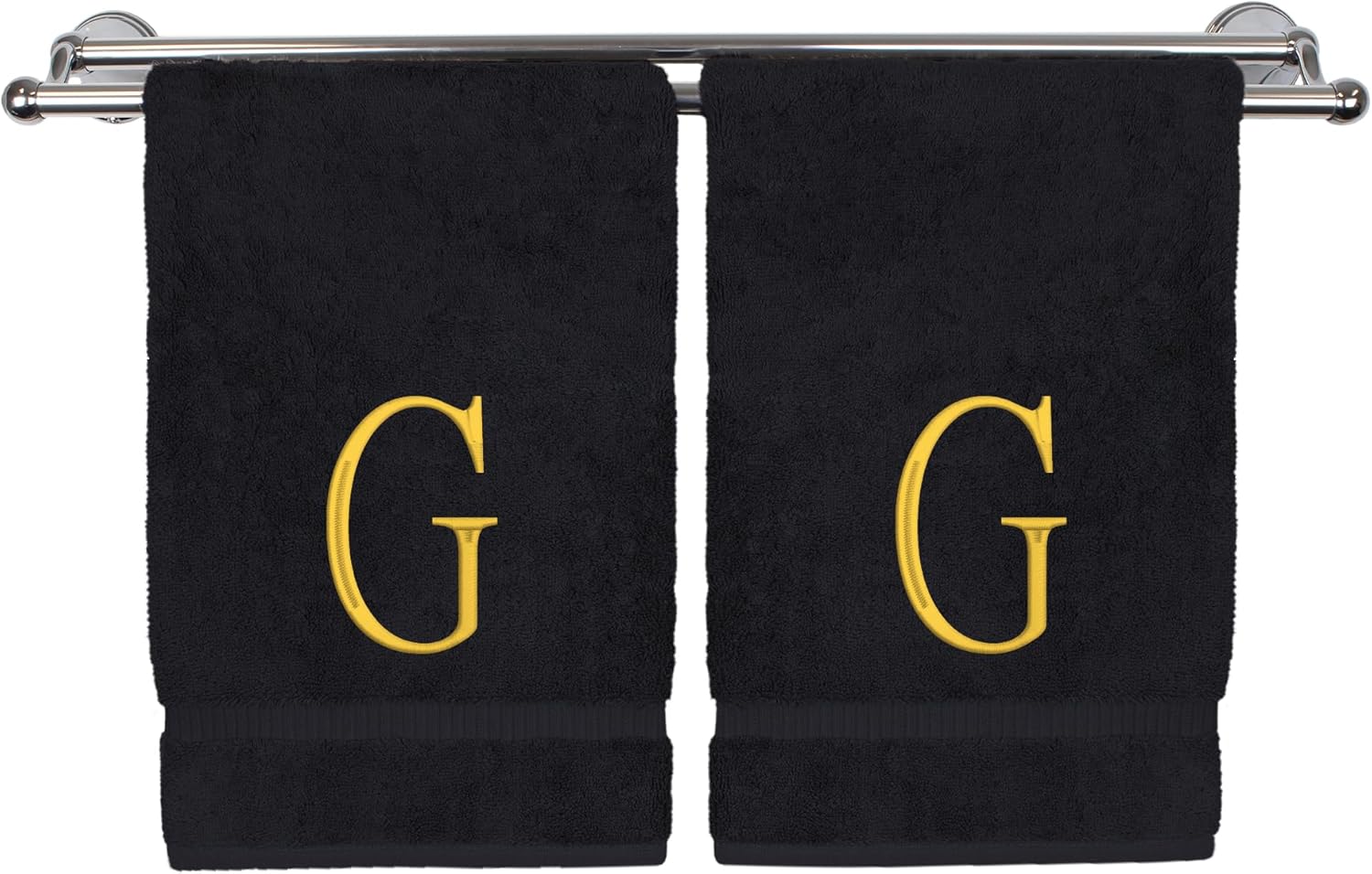 Monogrammed Hand Towel, Personalized Initial Gift, Extra Absorbent 100% Turkish Cotton - Soft Terry Finish - Set of 2 - Gold Block Initial G - Embroidered on Black Towels