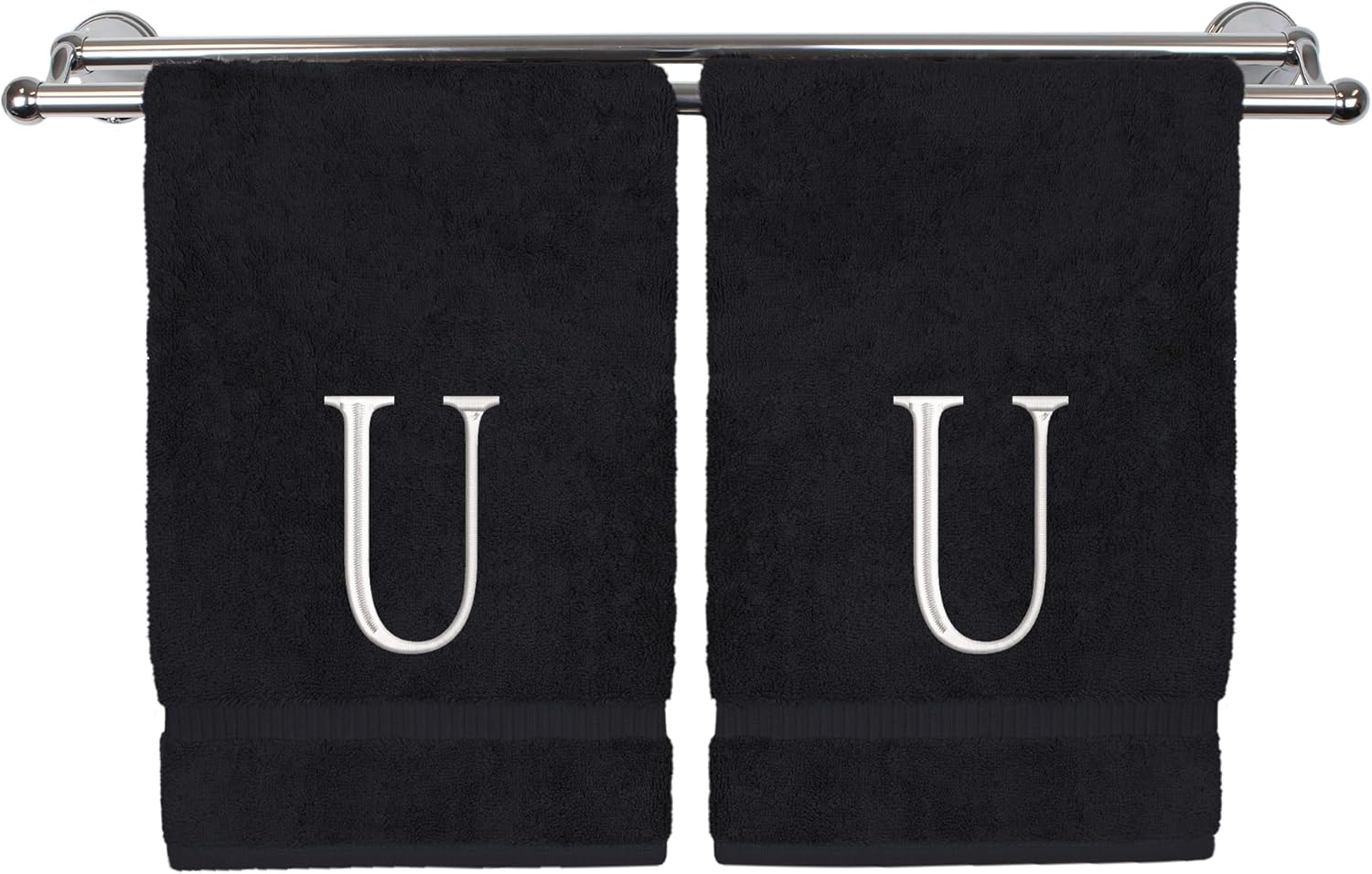 Monogrammed Hand Towel, Personalized Initial Gift, Extra Absorbent 100% Turkish Cotton - Soft Terry Finish - Set of 2 - White Block Initial U - Embroidered on Black Towels