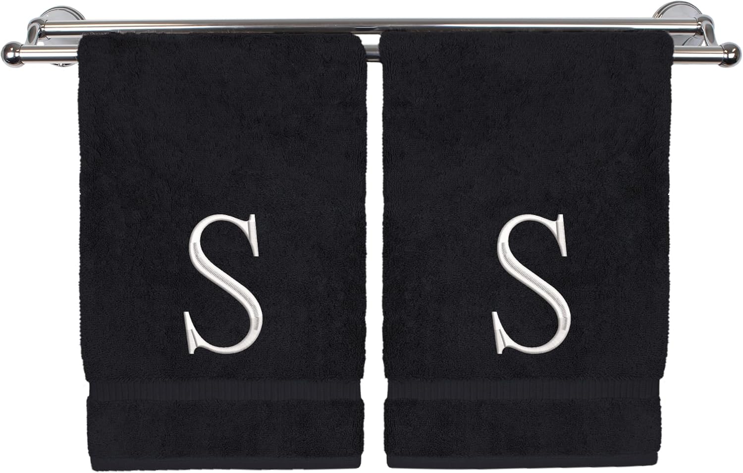 Monogrammed Hand Towel, Personalized Initial Gift, Extra Absorbent 100% Turkish Cotton - Soft Terry Finish - Set of 2 - White Block Initial S - Embroidered on Black Towels