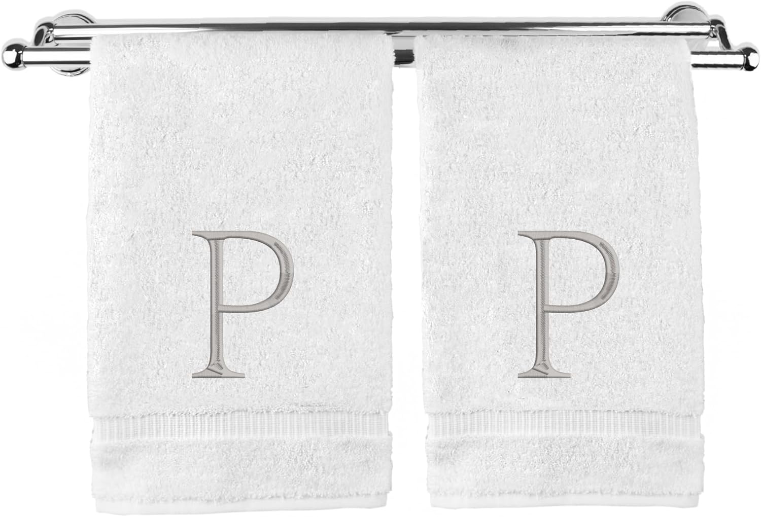 Monogrammed Hand Towel, Personalized Initial Gift, Extra Absorbent 100% Turkish Cotton - Soft Terry Finish - Set of 2 - Silver Block Initial P - Embroidered on White Towels