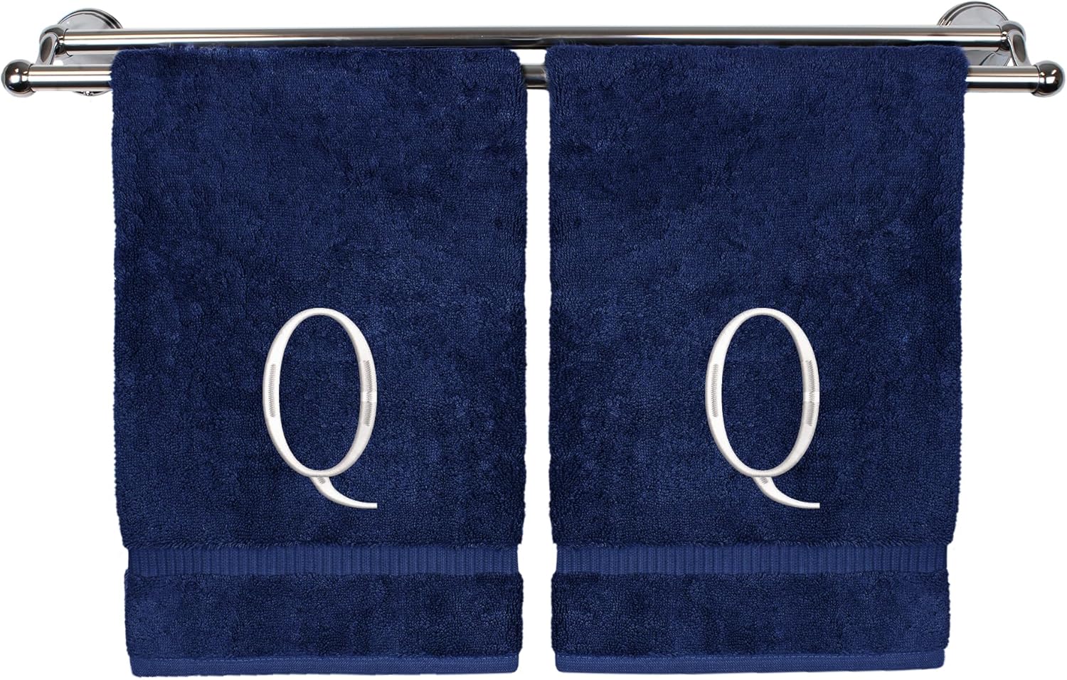 Monogrammed Hand Towel, Personalized Initial Gift, Extra Absorbent 100% Turkish Cotton - Soft Terry Finish - Set of 2 - White Block Initial Q - Embroidered on Navy Blue Towels