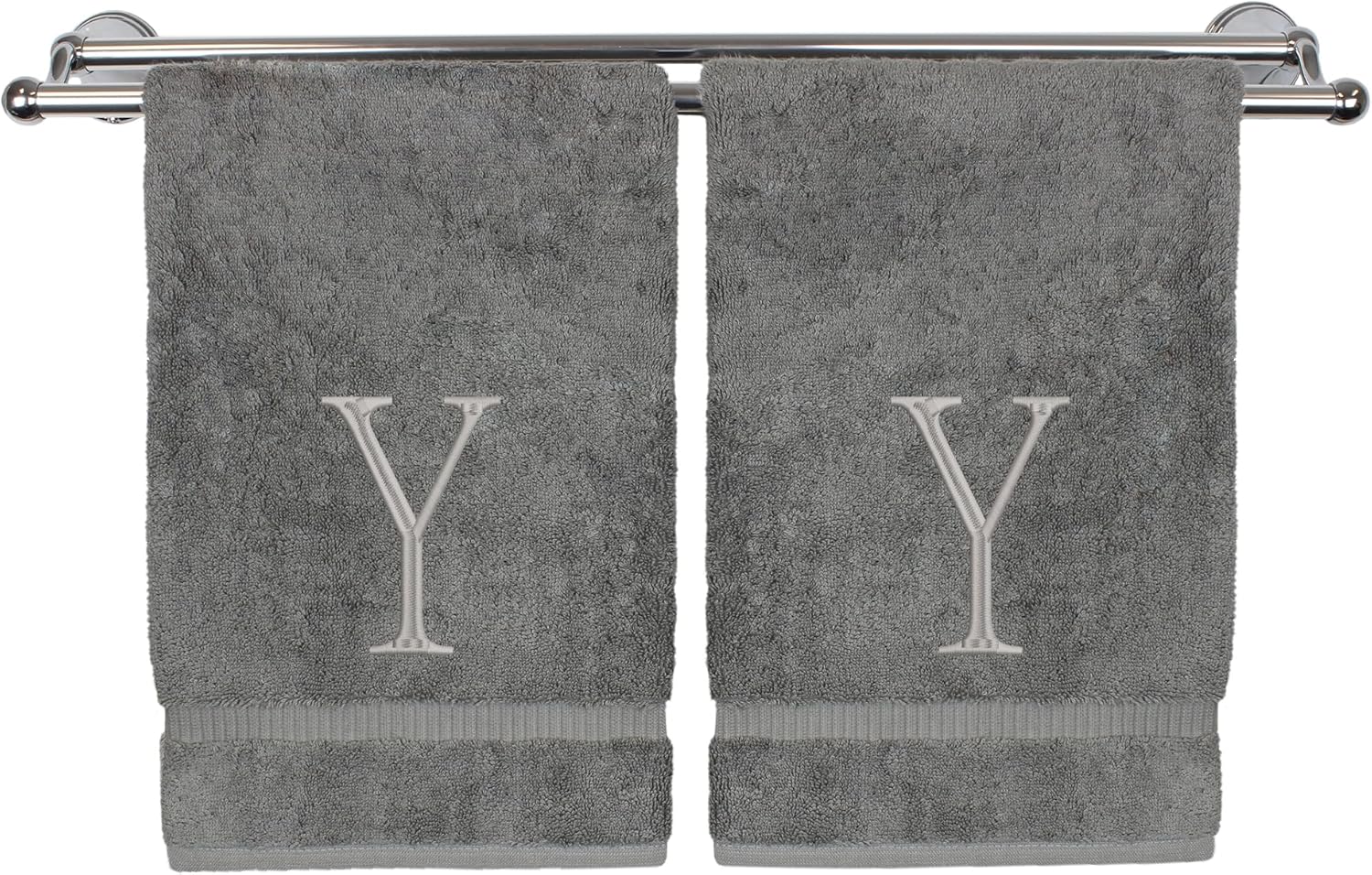 Monogrammed Hand Towel, Personalized Initial Gift, Extra Absorbent 100% Turkish Cotton - Soft Terry Finish - Set of 2 - Silver Block Initial Y - Embroidered on Grey Towels