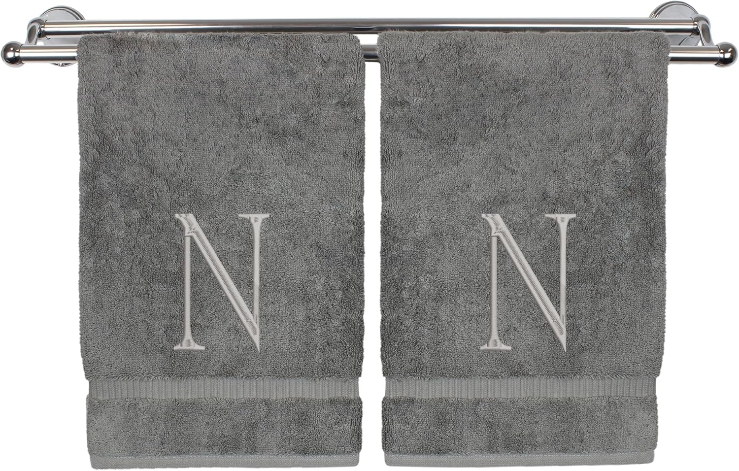 Monogrammed Hand Towel, Personalized Initial Gift, Extra Absorbent 100% Turkish Cotton - Soft Terry Finish - Set of 2 - Silver Block Initial N - Embroidered on Grey Towels