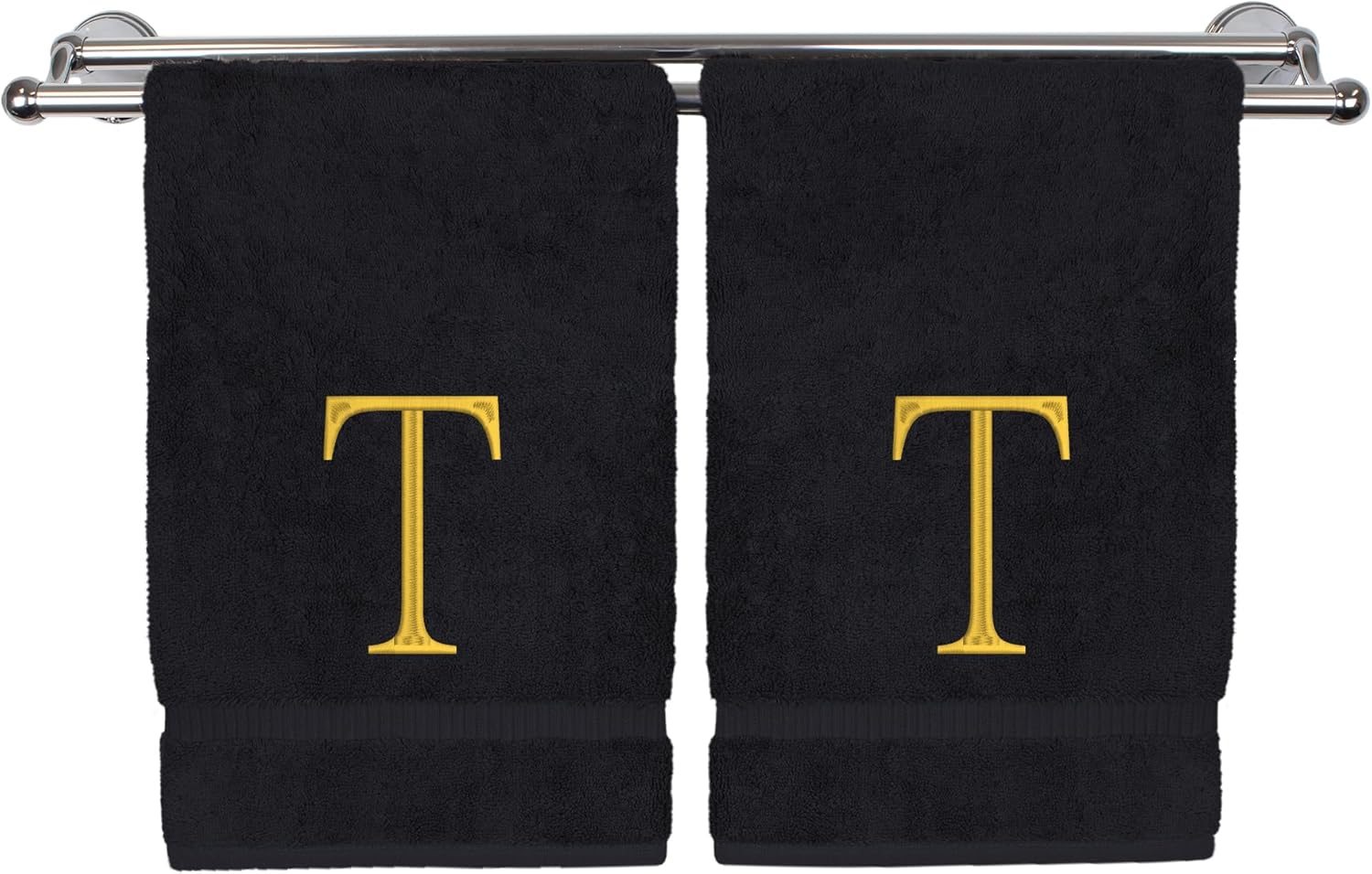 Monogrammed Hand Towel, Personalized Initial Gift, Extra Absorbent 100% Turkish Cotton - Soft Terry Finish - Set of 2 - Gold Block Initial T - Embroidered on Black Towels
