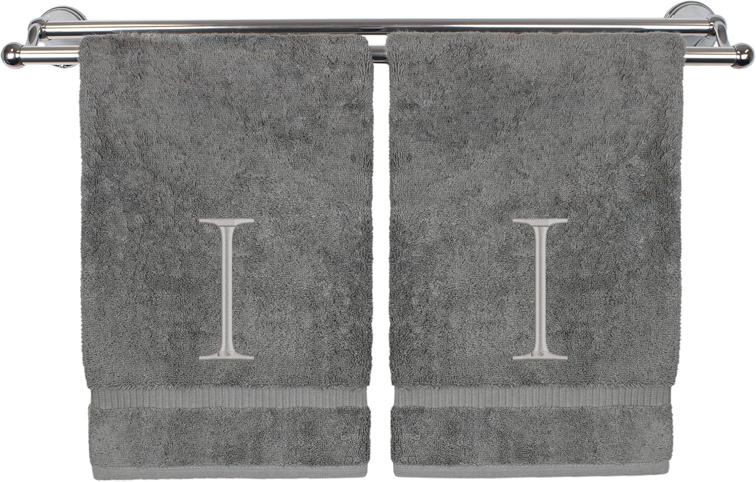 Monogrammed Hand Towel, Personalized Initial Gift, Extra Absorbent 100% Turkish Cotton - Soft Terry Finish - Set of 2 - Silver Block Initial I - Embroidered on Grey Towels