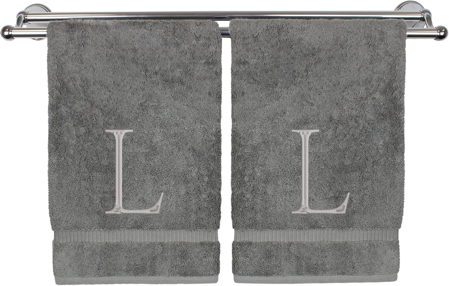 Monogrammed Hand Towel, Personalized Initial Gift, Extra Absorbent 100% Turkish Cotton - Soft Terry Finish - Set of 2 - Silver Block Initial L - Embroidered on Grey Towels