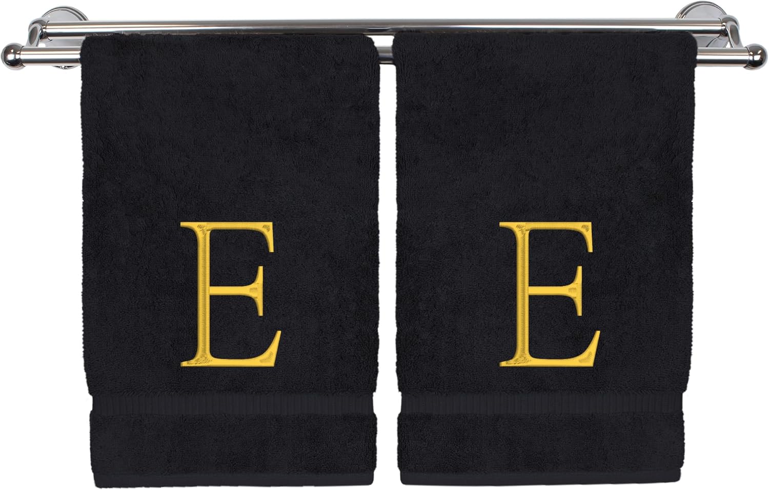Monogrammed Hand Towel, Personalized Initial Gift, Extra Absorbent 100% Turkish Cotton - Soft Terry Finish - Set of 2 - Gold Block Initial E - Embroidered on Black Towels