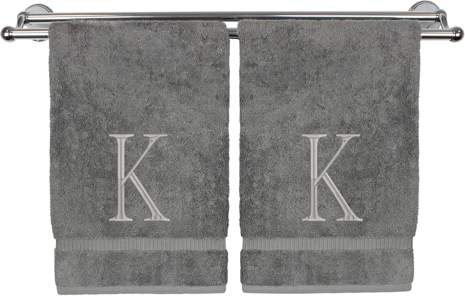 Monogrammed Hand Towel, Personalized Initial Gift, Extra Absorbent 100% Turkish Cotton - Soft Terry Finish - Set of 2 - Silver Block Initial K - Embroidered on Grey Towels