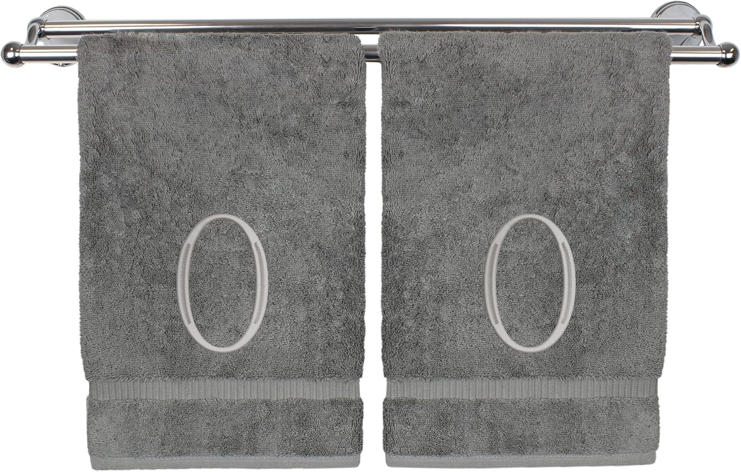 Monogrammed Hand Towel, Personalized Initial Gift, Extra Absorbent 100% Turkish Cotton - Soft Terry Finish - Set of 2 - Silver Block Initial O - Embroidered on Grey Towels