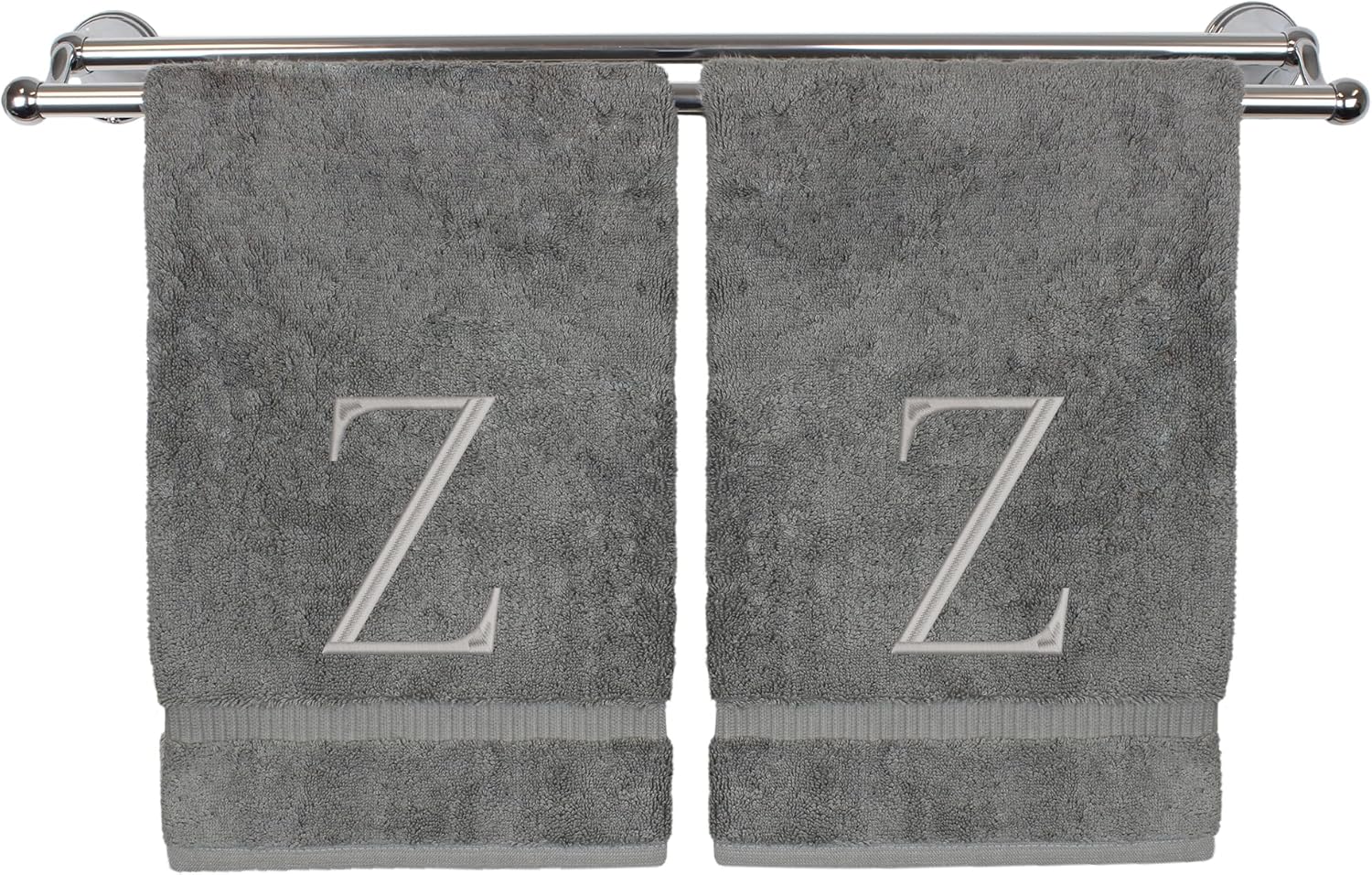 Monogrammed Hand Towel, Personalized Initial Gift, Extra Absorbent 100% Turkish Cotton - Soft Terry Finish - Set of 2 - Silver Block Initial Z - Embroidered on Grey Towels