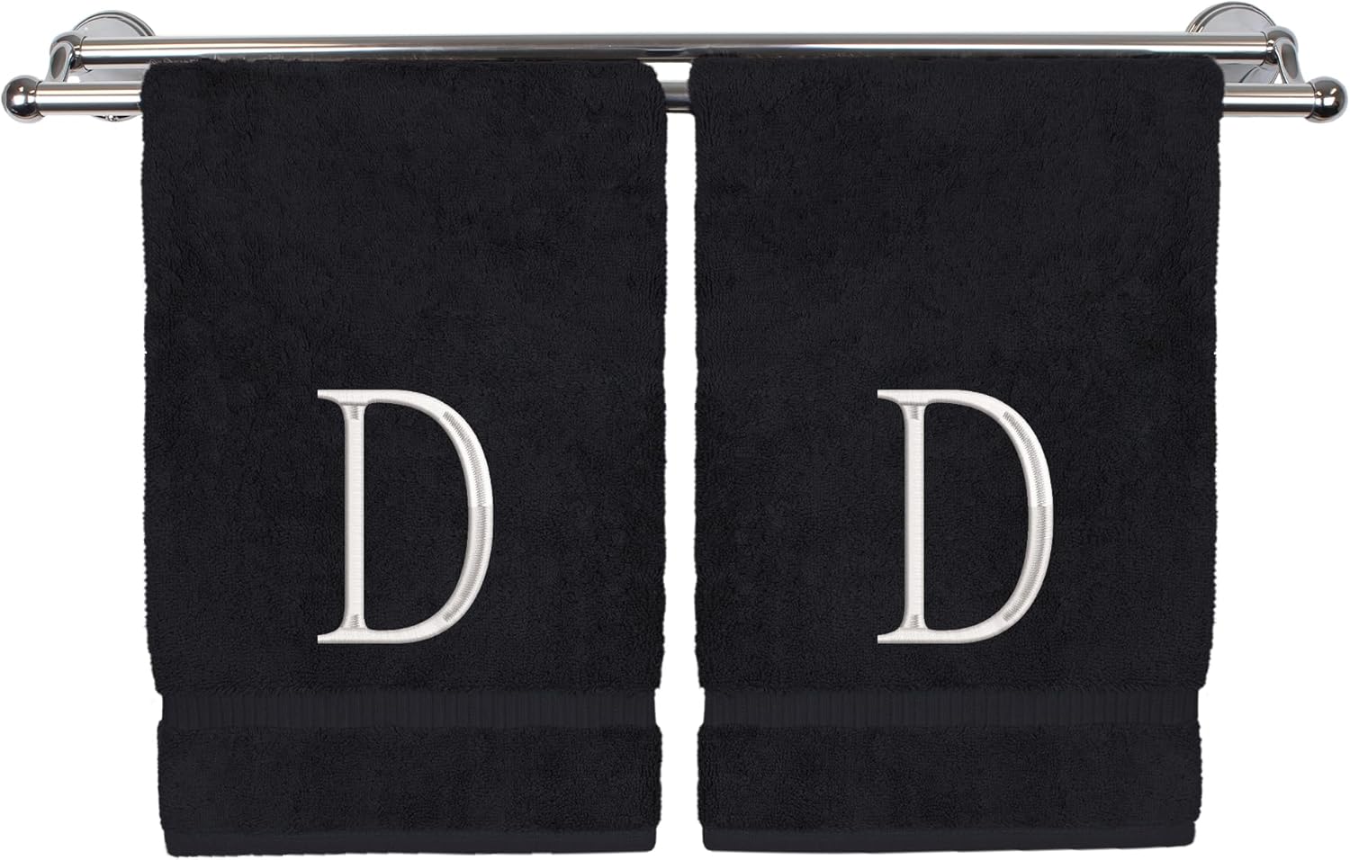Monogrammed Hand Towel, Personalized Initial Gift, Extra Absorbent 100% Turkish Cotton - Soft Terry Finish - Set of 2 - White Block Initial D - Embroidered on Black Towels