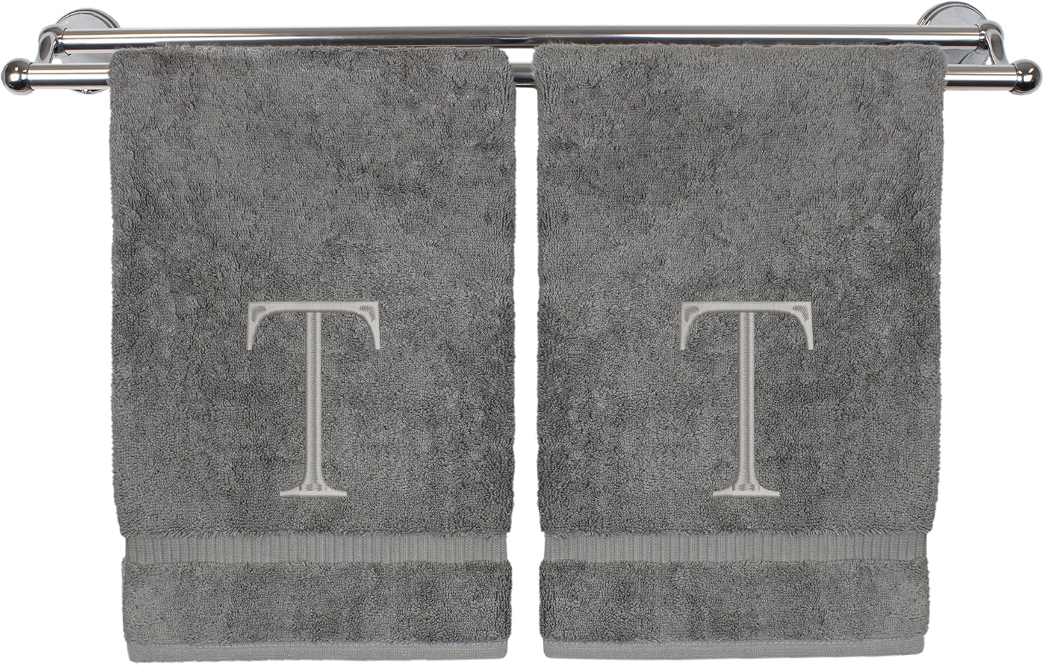 Monogrammed Hand Towel, Personalized Initial Gift, Extra Absorbent 100% Turkish Cotton - Soft Terry Finish - Set of 2 - Silver Block Initial T - Embroidered on Grey Towels