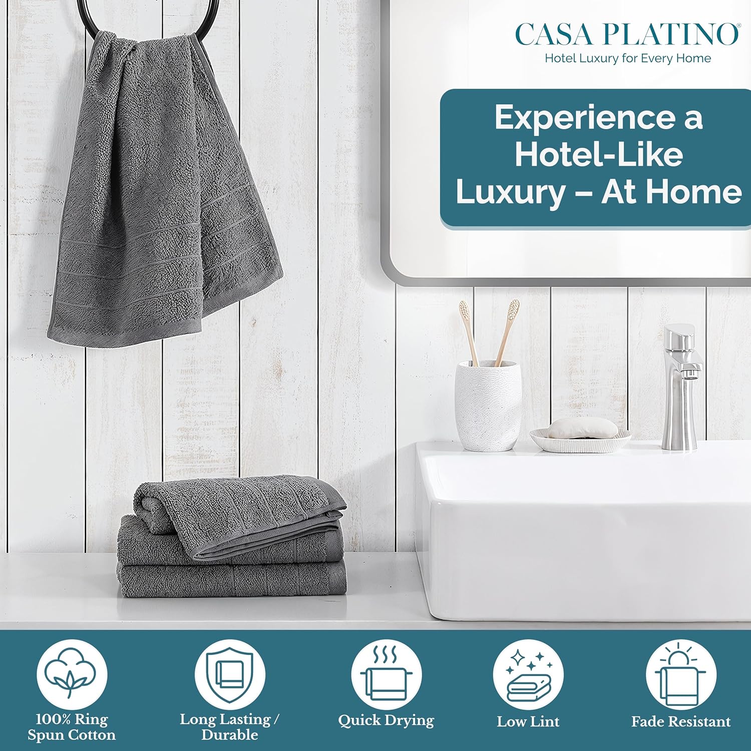 Casa Platino 100% Mercerized Cotton Hand Towels for Bathroom (16"x28") - Spa & Hotel Quality - Ring Spun - Quick Dry, Soft & Absorbent Bath Hand Towel Set of 4 - Pet Friendly, Pre Shrunk - Cool Grey