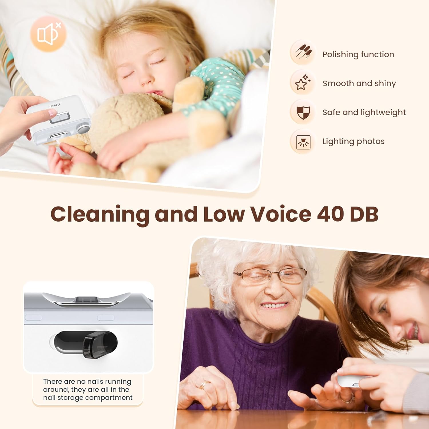 - ๐ฅ๐๐๐ ๐๐ถ๐ด๐ต๐ & ๐๐ผ๐ ๐ฉ๐ผ๐ถ๐ฐ๐ฒ: Electric nail clippers,LED Light soft light design, not shaking eyes, even when used at night without turning on the light can also cut the desired nails, so that the mother to cut the baby's nails more convenient, 45DB, very low voice working condition does not affect the baby's rest.