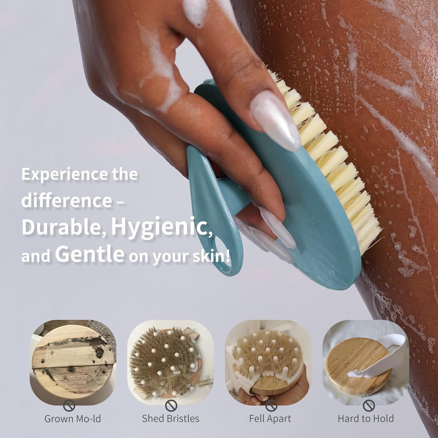- SAFE & HYGIENIC, NON-MOLD: Our shower brush is made from high-quality plastic with an integrated molding process. Unlike loofah sponges, it’s non-porous, meaning it doesn’t absorb water, dries quickly, and won’t trap dirt or bac-teria. Unlike wood brushes, the material is naturally resis-tant to mo-ld, even when exposed to a damp environment over time. It’s the safer and more hygienic choice for your skin.