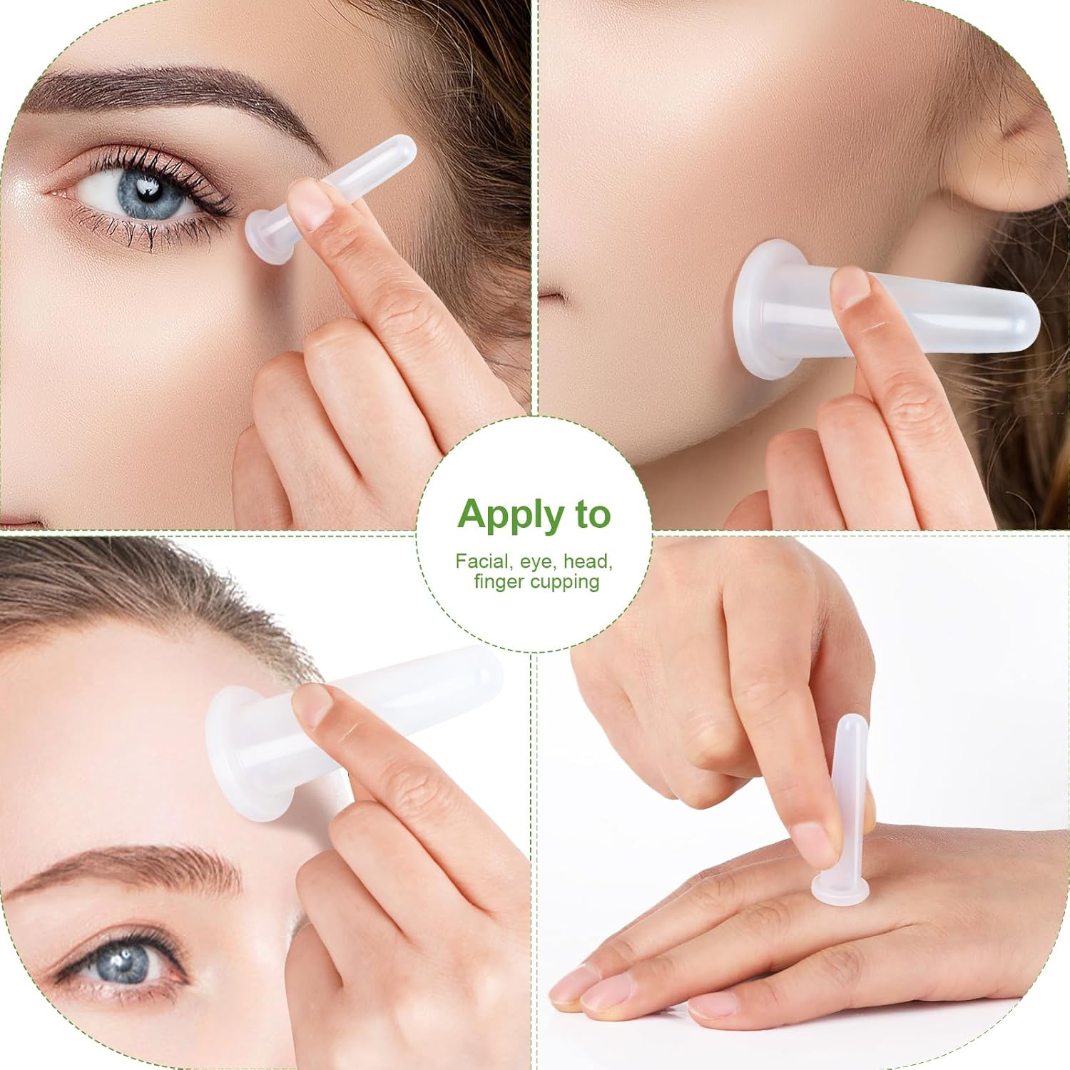 - MASSAGE CUPPING SET FOR FACE CARE: Two small silicone massage cuppings, designed for the delicate skin around the eyes, promote blood circulation, reduce wrinkle and puffiness. Two medium-sized silicone cupping are suitable for face and other body parts.The structure is simple, convenient and practical, strong in adsorption, and not easy to fall off. Both are convenient for use at home as well as when traveling outside