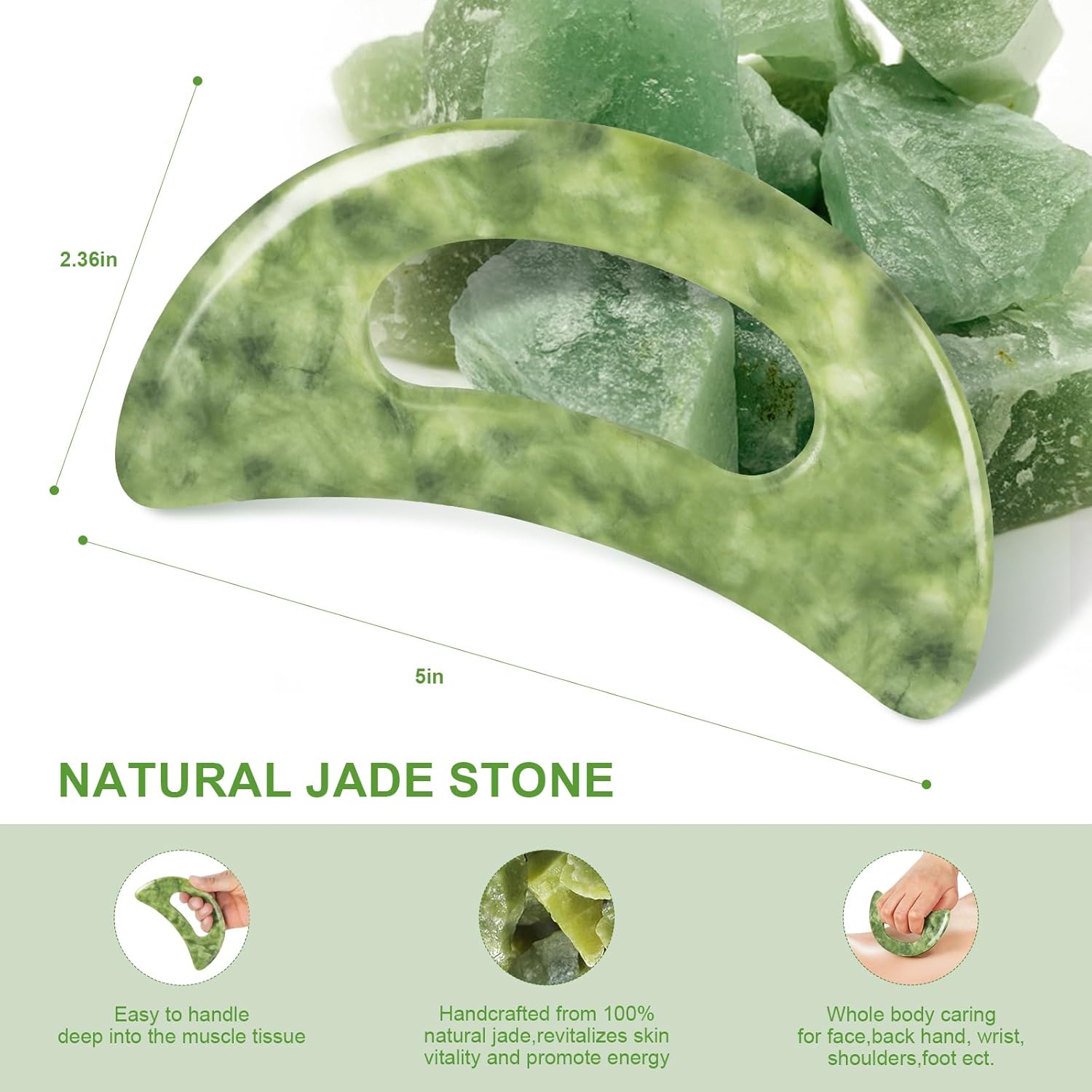 - JADE STONE LARGE MASSAGE TOOL:The large guasha tool is handcrafted from 100% authentic Jade Gua Sha Stone from Anshan city, Liaoning province. The jade stone is known for promoting balance and good energy which will have a positive effect on your skin