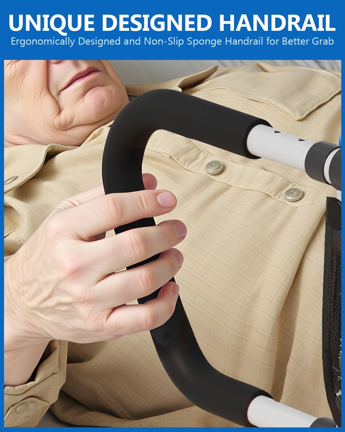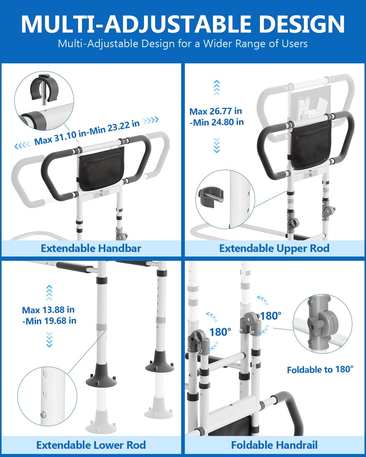 - Fully Adjustable Design: Telescoping handbar (23.22"–31.10") and rods (upper 24.80"–26.77", lower 13.88"–19.68") fit most bed sizes. Foldable 180° handrail for easy storage and transport.