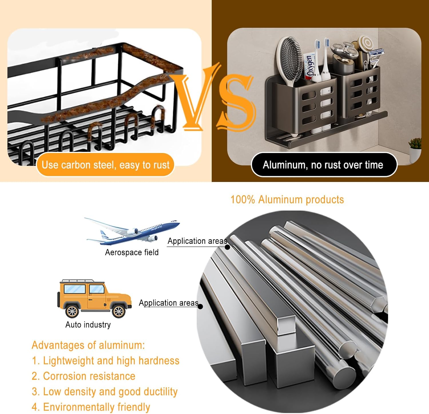 Aluminum Toothbrush Holder Self-Adhesive Hanging Bracket Shower Toothbrush Razor Holder Suitable for Toothbrush, Toothpaste, Razor and Comb etc Bathroom Storage