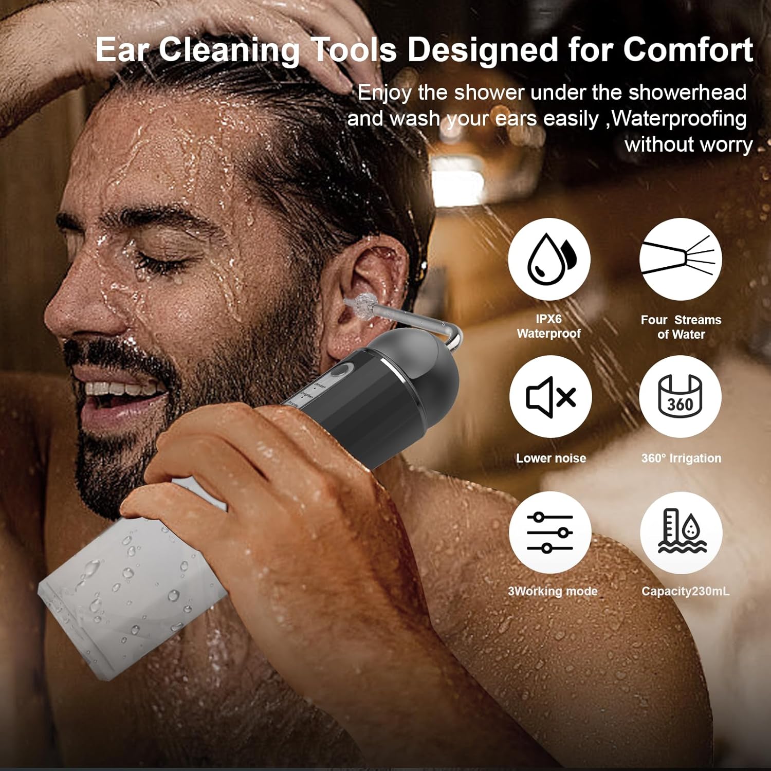 • Portable Design: With an IPX6 waterproof rating and a 230ML detachable water tank, this device is easy to fill and ideal for use in the shower, offering a worry-free and comfortable cleaning experience.Comes with 6 reusable 4-hole earplugs.