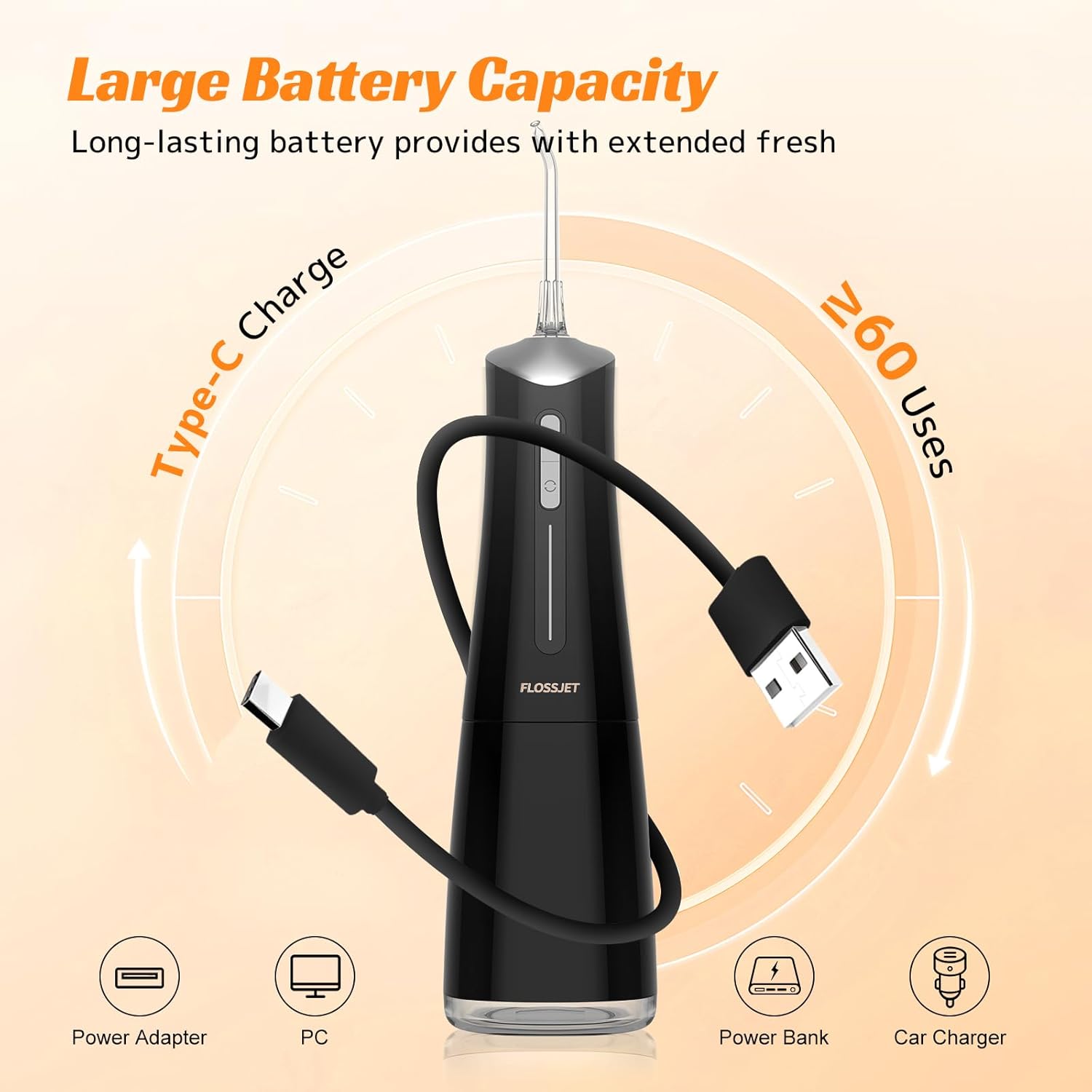 - Extended Battery Life and Portable Design: The FlossJet oral irrigator features a built-in high-capacity lithium battery that provides 14 to 21 days of use on a single charge, eliminating the hassle of frequent recharging. The USB-C charging port design ensures a convenient charging process, making it ideal for everyday use and travel. This water flosser design and noise level below 58 decibels create a comfortable user experience, allowing you to enjoy professional oral care anytime, anywhere.